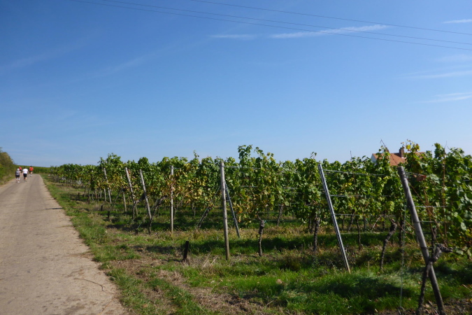 Die Aussicht ist fantastisch: wenn man die Steigung hinter sich gelassen hat, liegt rechts unten das verträumte Kleinkarlbach zu unseren Füßen. Die Weinbaugemeinde liegt im “Herzen des Leiningerlandes”, im Landkreises Bad Dürkheim in der Pfalz. Das milde Klima ist für Weinbau optimal geeignet. Westlich geschützt durch die Ausläufer des Haardtgebirges gedeihen hier Riesling, Morio-Muskat, Silvaner, Gewürztraminer, Portugieser, Spät- und Weißburgunder. Daneben werden traditionell aus heimischem Obst hochwertige Schnäpse gebrannt. Von besonderer Bedeutung für den Ort waren früher, neben dem Weinbau, die Mühlen, von denen fünf noch teilweise erhalten sind. Eine davon ist auch heute noch in Betrieb. Daher wird Kleinkarlbach auch „Dorf der Mühlen und Brunnen“ genannt.