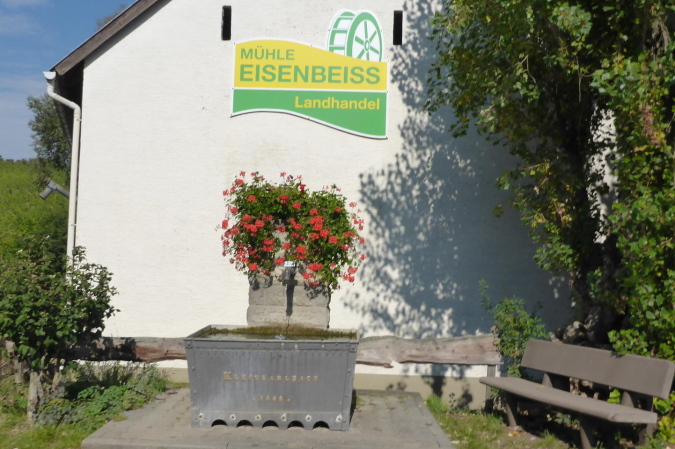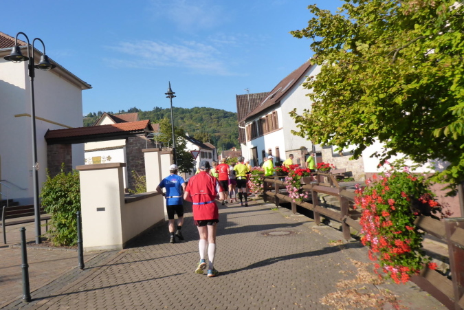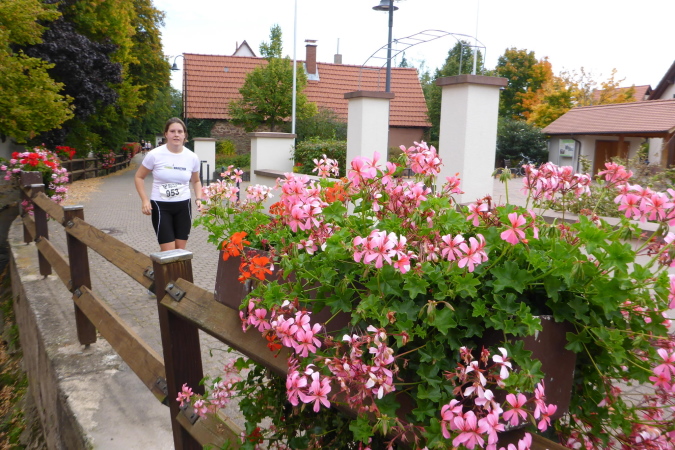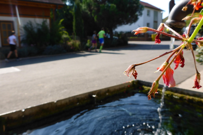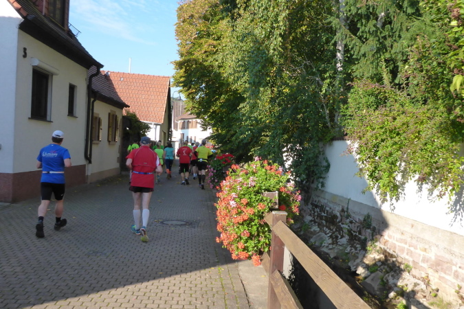 Die Startlinie ist mit roter Farbe gekennzeichnet. Als sich alle dahinter versammelt haben, geht es los. Der schmale Bachweg erlaubt maximal drei Personen nebeneinander. Im dichten Feld scheint es jedoch keiner so richtig eilig zu haben. Wenn vorne Tempo gemacht wird, bekommen wir das hinten jedenfalls nicht mit. Es geht im Schatten am Eckbach entlang, über eine kleine Brücke, der Weg wird breiter und führt an Wohnhäusern vorbei. Die Geranien sind in voller Blüte. Am Gemeindehaus geht es scharf rechts.