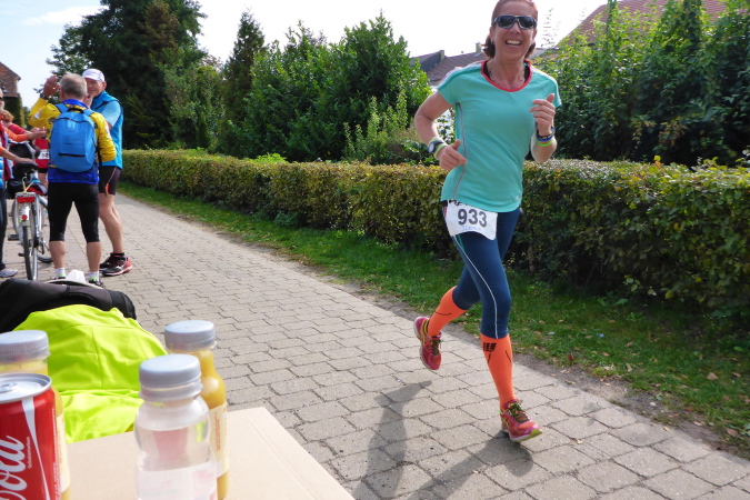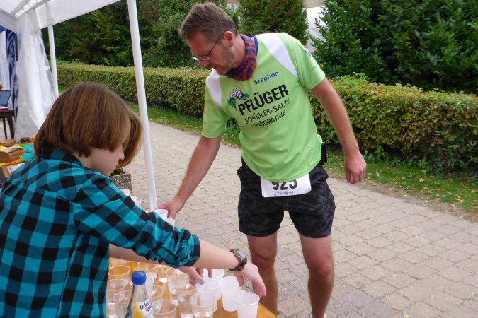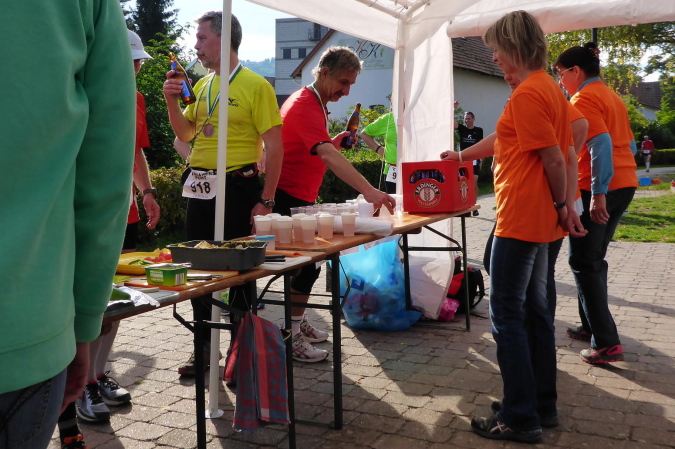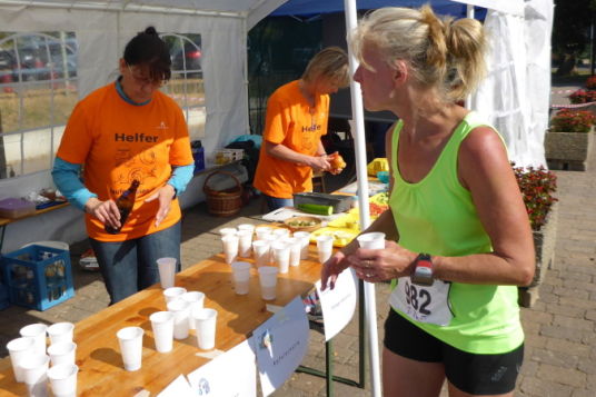 Nach der zweiten Runde schaue ich das erste Mal beim Verpflegungszelt vorbei. Es gibt allerlei Kuchen, Nüsse, Kekse und diverses Gemüse. Dazu Erdinger, Wasser, Cola, Iso und Tee. Die Helfer sind im Dauereinsatz. Becher füllen und frisches Gemüse schneiden sind Akkordarbeit. Mit fast 13 Jahren ist Johanna die jüngste Helferin. Ihr Engagement kommt bei den Läufern gut an. Sie scheint stets den Überblick zu bewahren und lässt sich auch von ausgefallenen Wünschen nicht aus der Ruhe bringen.
