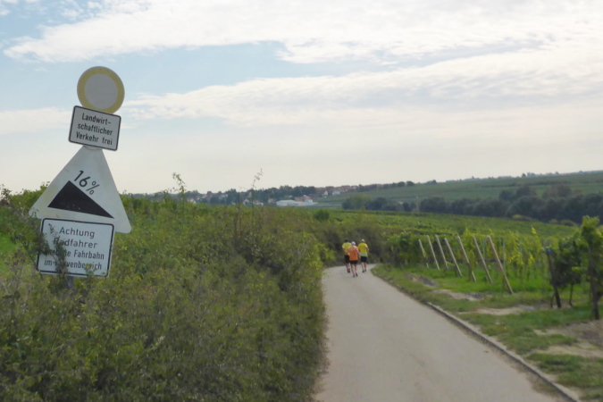 Der Weg wird flach und führt an den Reihen bereits abgeernteter Rebstöcken vorbei, leicht bergab. An der nächsten Kreuzung zeigt der rote Pfeil wieder rechts. Ein Schild kündigt ein Gefälle von 16 % an. Das ist so steil, dass man gerade noch locker laufen kann. Unten hinter dem Gelände der Schleifmühle geht es nochmals rechts. Wir sind wieder auf dem Bachweg, der hier noch Straße ist. Mit Schildern werden die Autofahrer wegen des Laufes zur Vorsicht ermahnt. Als der Weg wieder zum schmalen Radweg wird (km 2), ist das Läuferfeld bereits so auseinander gezogen, dass man sein Tempo frei wählen kann. Hinter einer S-Kurve liegt wieder der Startbereich. Die ganze Runde ist offiziell vermessen und knapp 2500 m lang.