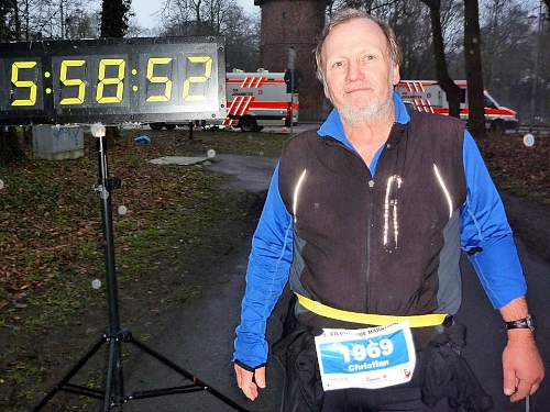 Etwa 1000 Teichwiesenmarathons gab es bisher, davon hat Christian, der Marathonhamster, etwa 950 absolviert. “Gar nicht verrückt ist auch nicht normal!” Heute finisht er mit 5:55:55 Stunden.
