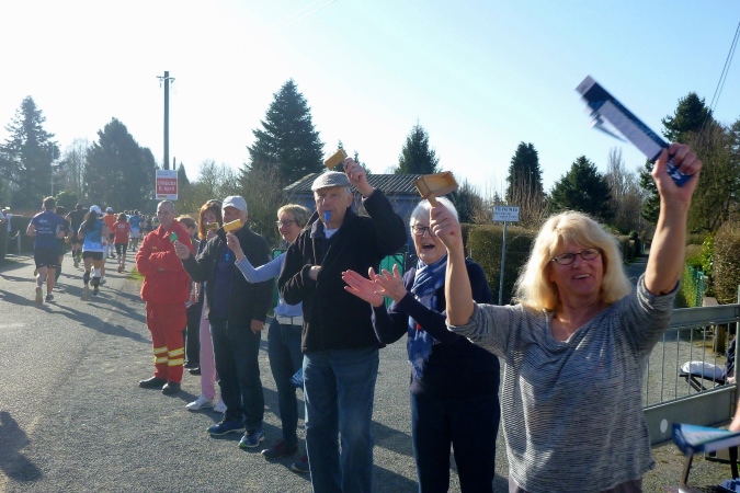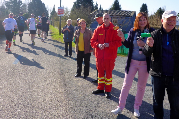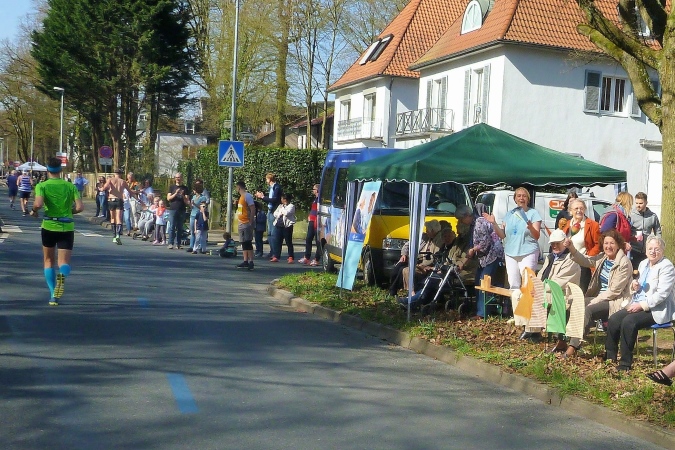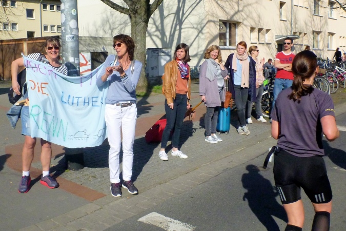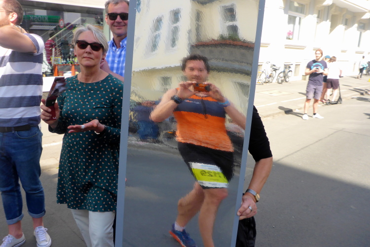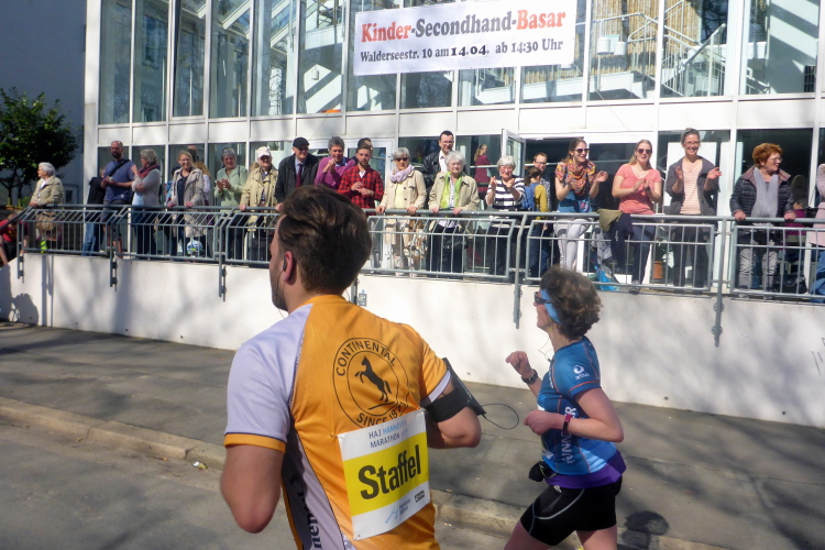 Aus meiner vermeintlich lockeren Aufholjagd auf die Vier-Stunden-Pacer scheint nichts mehr zu werden. Der Abstand verringert sich nur sehr langsam. Dafür gibt es Anfeuerungen von älteren Herrschaften aus einem Alters- und Pflegeheim. Natürlich in bestem Sonntagsgewand.