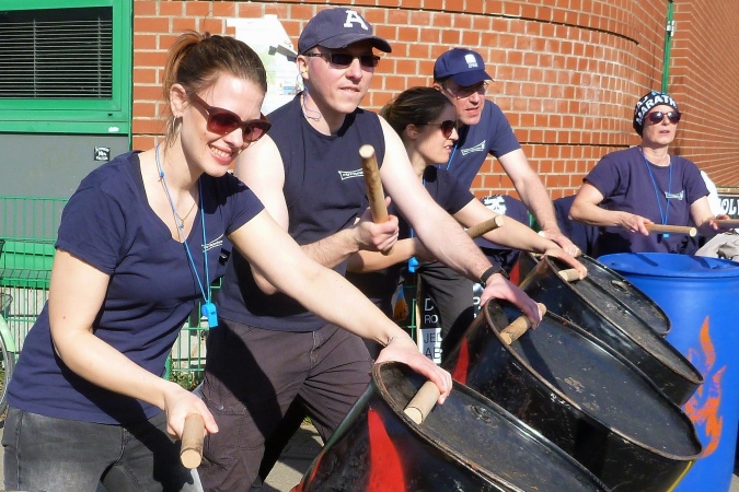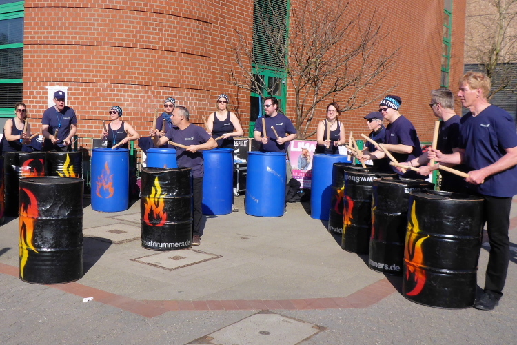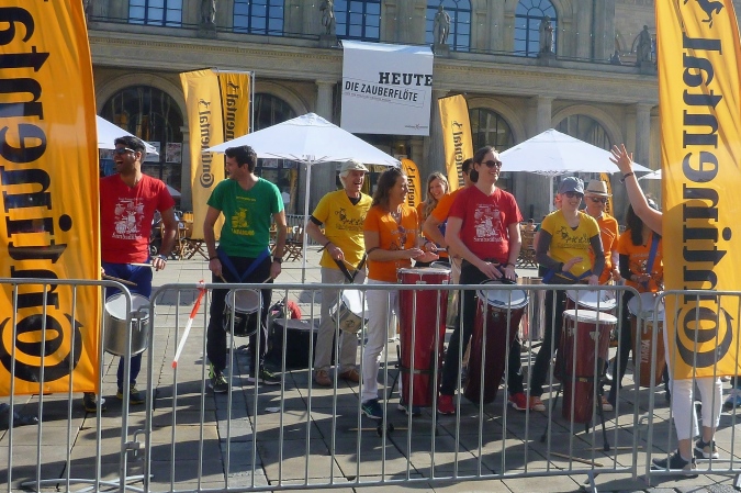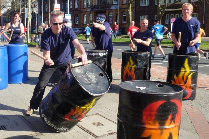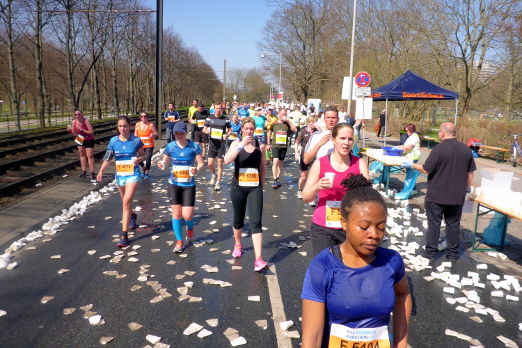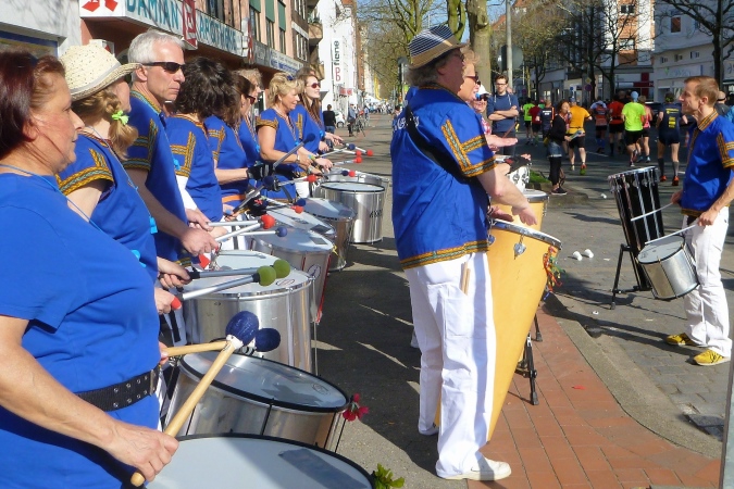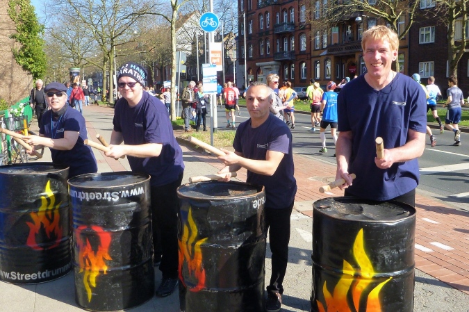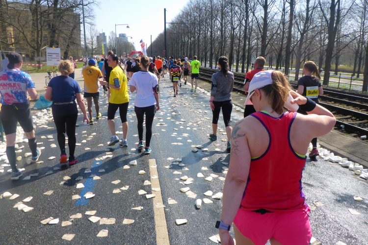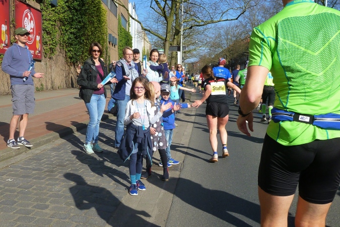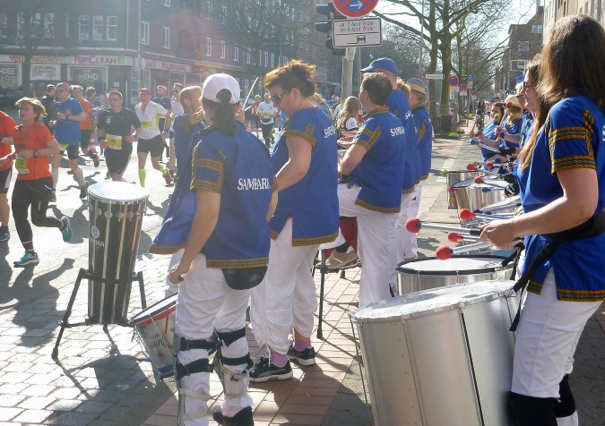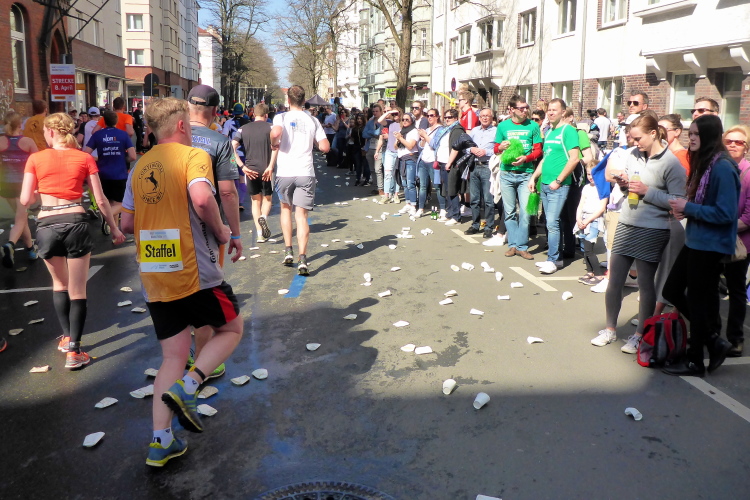 Die Staffelwechsel, fünf an der Zahl, liegen immer in Seitenstraßen und stören somit fast nicht. Wir kommen erneut zur Rückseite des Hauptbahnhofs. Kurze Trennung von den „Halben“. Wir müssen um den Block herum. Dann sind wir wieder vereint. Nochmals in ein schickes Viertel. Vahrenwald nennt sich das. Wie an den Markierungen ersichtlich, fehlen uns noch einige zusätzliche Meter. Also bei km 33 auf die breite Vahrenwalder Straße. Die Sonne steht hinter uns. Wenigstens das. Zuschauer haben Erbarmen und lassen uns nicht allein auf diesen anspruchsvollen zwei Kilometern. Sambatruppe. Dann der Verpflegungsstand, gut bestückt mit Wasser, Iso, Cola, Bananen, Äpfeln... lustiges Personal inklusive. Auch drei bis vier Toilettenhäuschen. So mindestens alle fünf Km und dazwischen noch Wasserstellen für die Schwämme. Ich greife jetzt oft zu. Das kalte Leitungswasser erfrischt auch Kopf und Rücken.