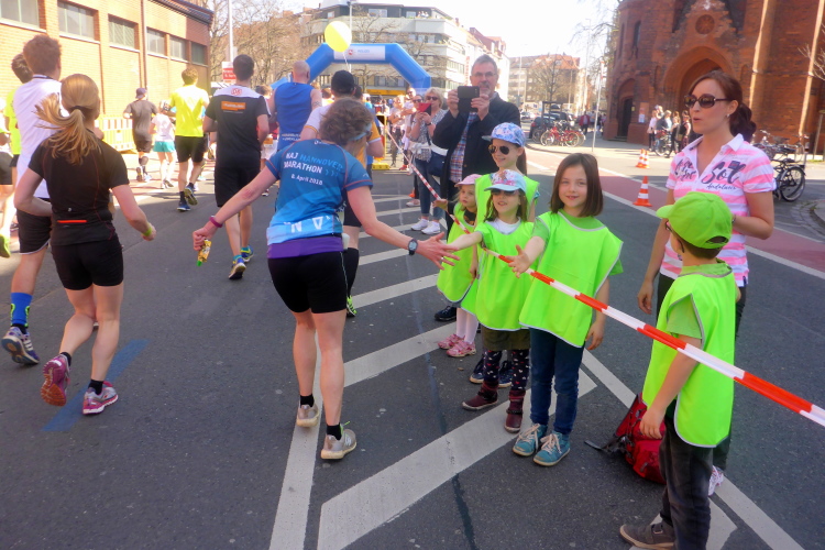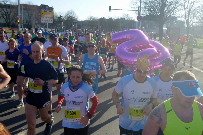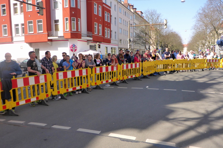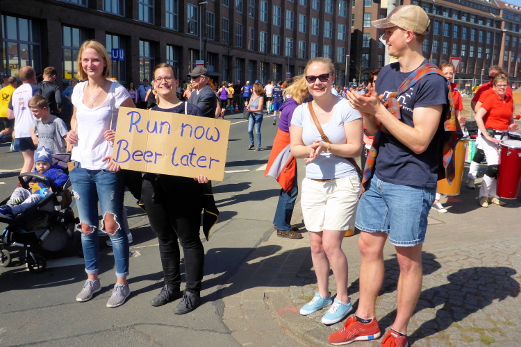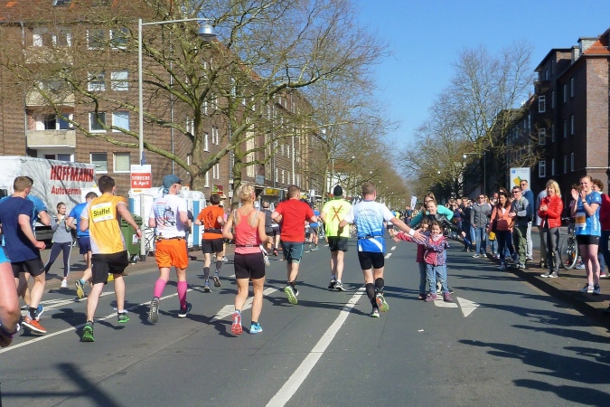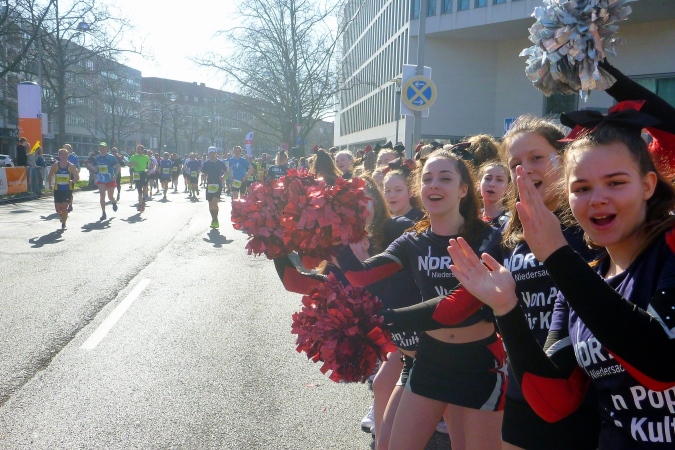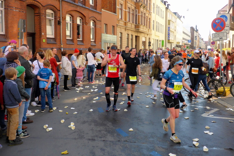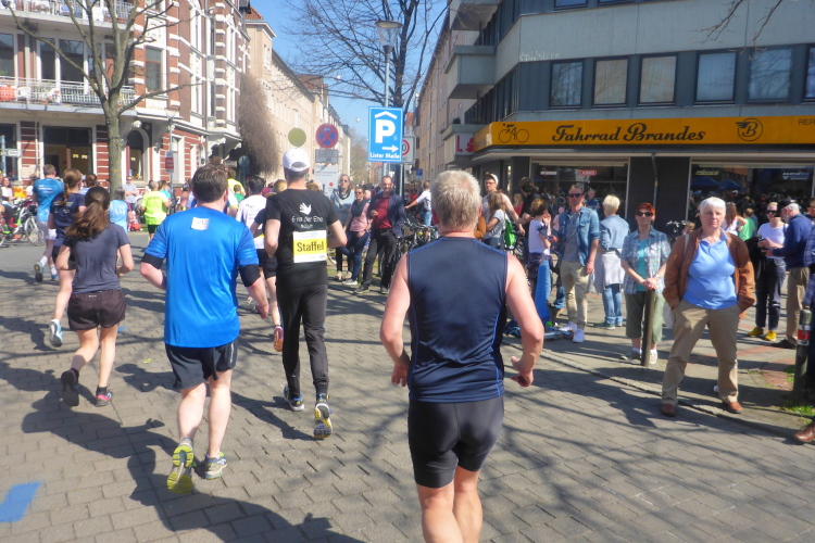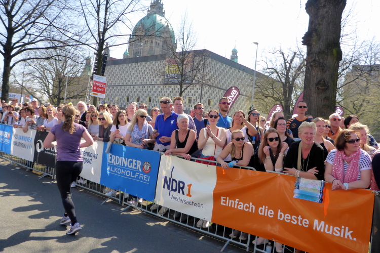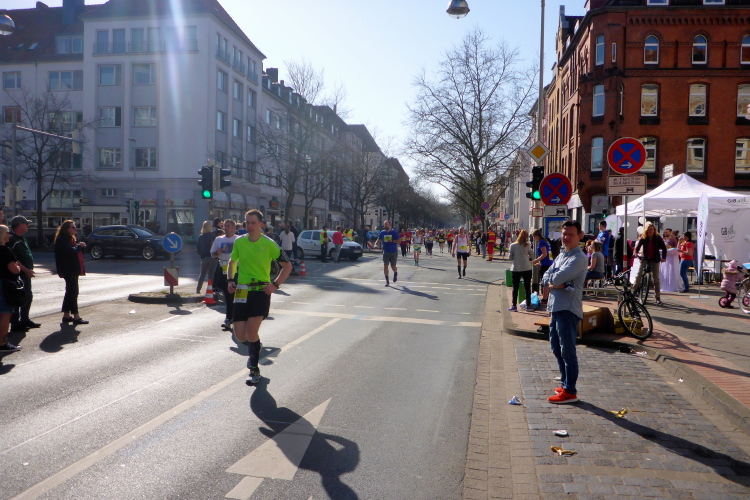 Hier auf der Hildesheimer Straße geht es richtig zur Sache: Unzählige Stimmungsnester warten auf uns sowie beeindruckend viele und aktive Zuschauer. Unglaublich, wie begeisterungsfähig die Leute auch bei der 28. Austragung des Laufs sind. Man kommt quasi nicht zur Ruhe. Kinderhände abklatschen, Fotos schießen, witzige Kommentare hinaus schmettern. Ich frage Judith, wie man wohl auf Bayerisch „Danke“ sagt, um ein bisschen exotisches Flair hineinzubringen. „Vergelt`s Gott" fällt ihr ein und das habe ich in meiner Jugend auch oft gehört. Aber soll ich das wirklich einem jungen Hannoveraner Mädchen zurufen, das mich begeistern anfeuert?