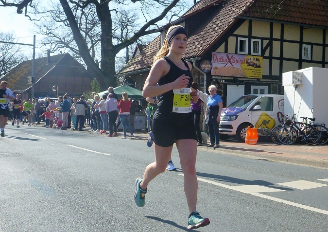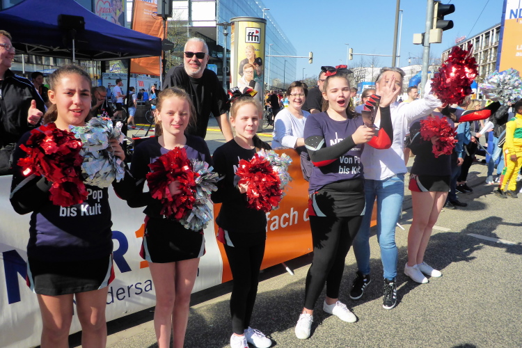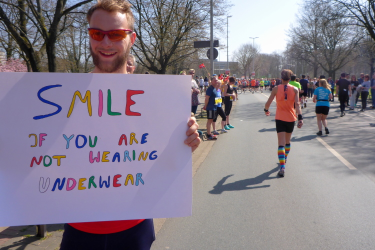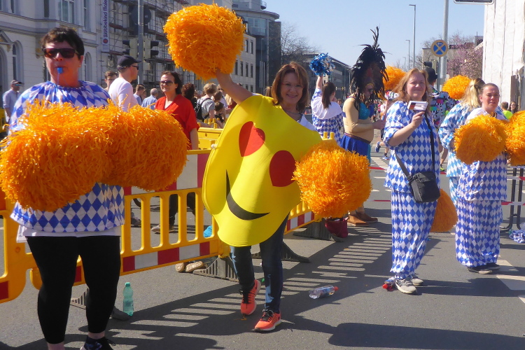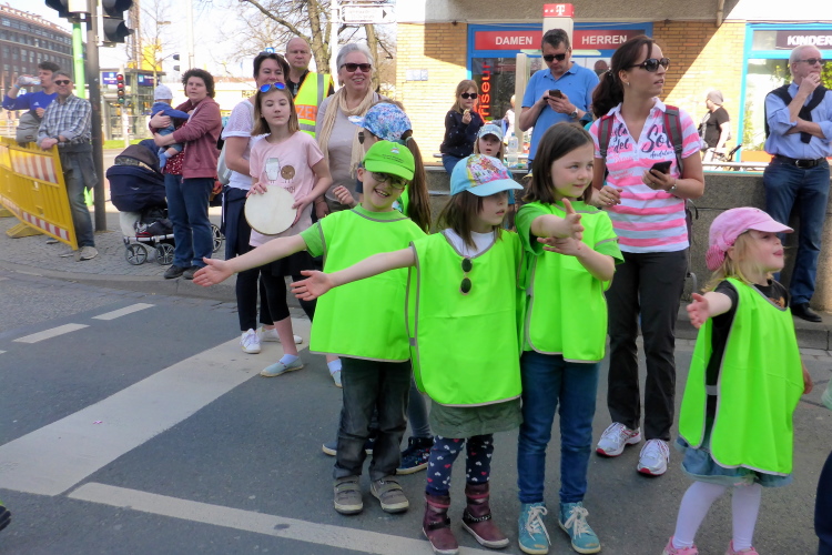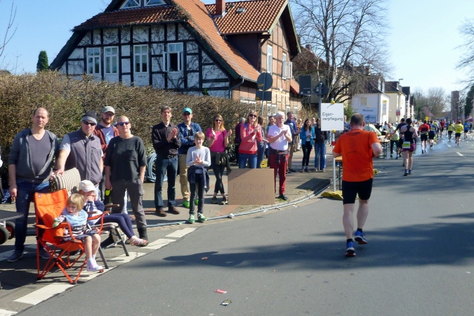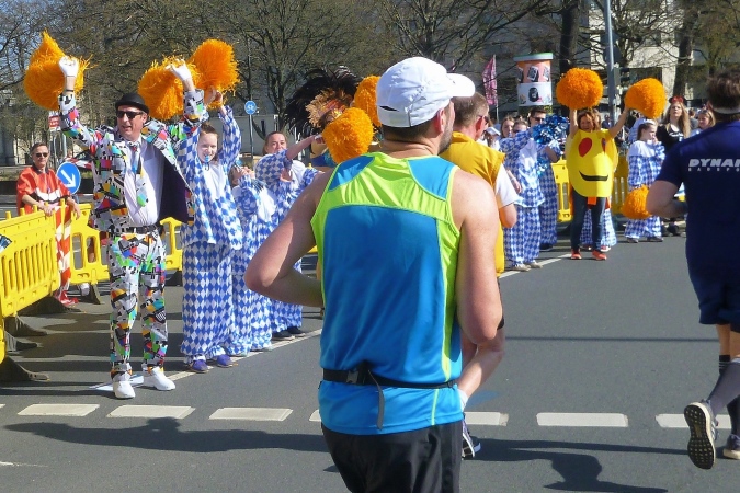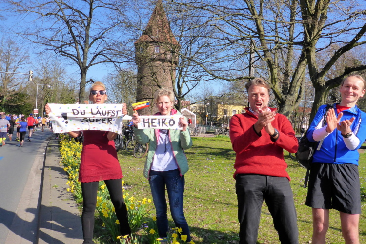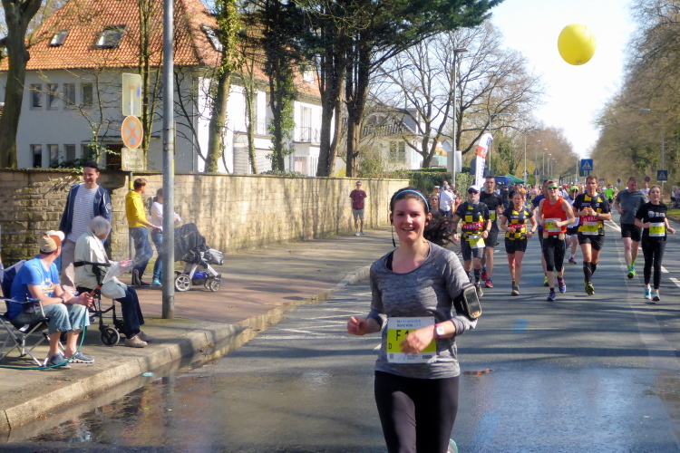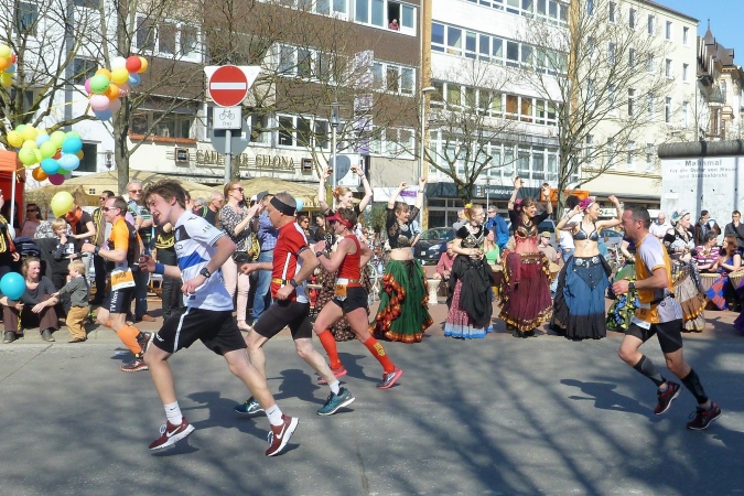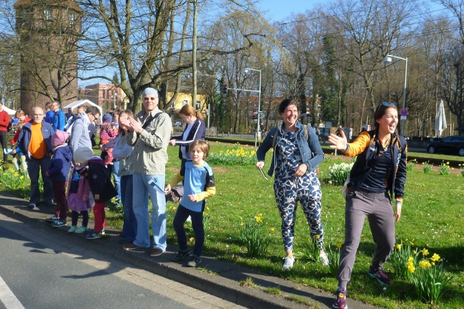 Hier auf der Hildesheimer Straße geht es richtig zur Sache: Unzählige Stimmungsnester warten auf uns sowie beeindruckend viele und aktive Zuschauer. Unglaublich, wie begeisterungsfähig die Leute auch bei der 28. Austragung des Laufs sind. Man kommt quasi nicht zur Ruhe. Kinderhände abklatschen, Fotos schießen, witzige Kommentare hinaus schmettern. Ich frage Judith, wie man wohl auf Bayerisch „Danke“ sagt, um ein bisschen exotisches Flair hineinzubringen. „Vergelt`s Gott" fällt ihr ein und das habe ich in meiner Jugend auch oft gehört. Aber soll ich das wirklich einem jungen Hannoveraner Mädchen zurufen, das mich begeistern anfeuert?