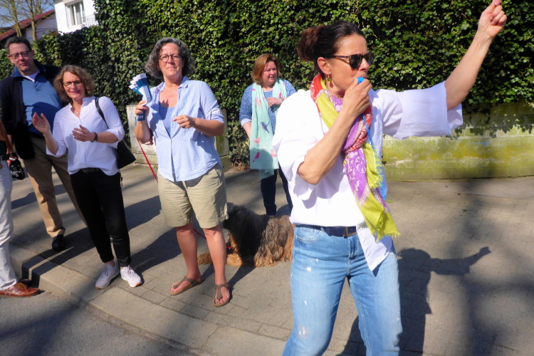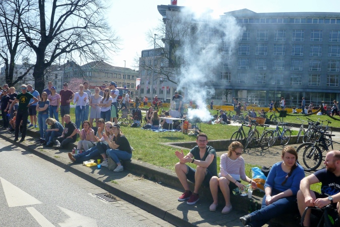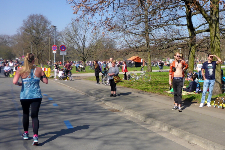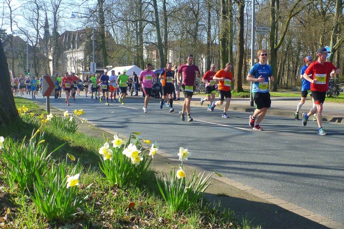 Unter der Bahn durch und wieder ins Leben, Nordstadt. Leicht alternativ wirkt das hier. Schwule Sau - So heißt eine Kneipe. Dann das stattliche Gebäude der Leibniz-Universität. Der Philosoph, Mathematiker, Diplomat und Historiker Gottfried Wilhelm Leibniz war seit 1676 Hofrat und Leiter der Bibliothek. Viele junge Leute feuern uns mit Biergläsern in der Hand an. Ich nutze jede Gelegenheit, etwas Tempo rauszunehmen. Haha. „Neutralisierte Zone“ steht hier. Später lese ich, dass dies bei Radrennen die Gefahrenstellen entschärfen soll: Das Tempo wird gedrosselt. Die Herrenhäuser Allee ist gesäumt von blauen Frühlingsblumen. Der Geruch von Holzkohle, Grillanzünder und gebratenem Fleisch wird mir schon fast zu viel. Einige Studierende feuern uns an. Barfuß. Die Ärmsten.