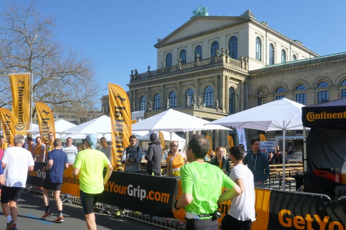 Am futuristischen Verwaltungsgebäude der Nord/LB vorbei. Wir sehen auf der rechen Seite die Oper. Davor der Stand vom Sponsor Continental. Der Regensburg Marathon führt ja über die Teststrecke des Unternehmens. Am Boden befinden sich Platten mit den Wappen der Partnerstädte. In fast allen gibt es auch einen Marathon.