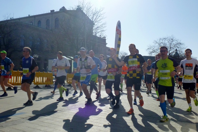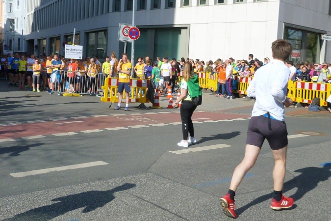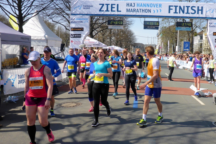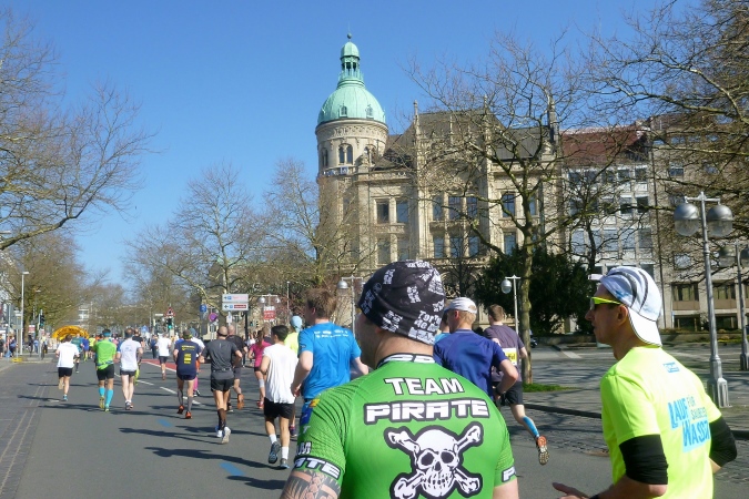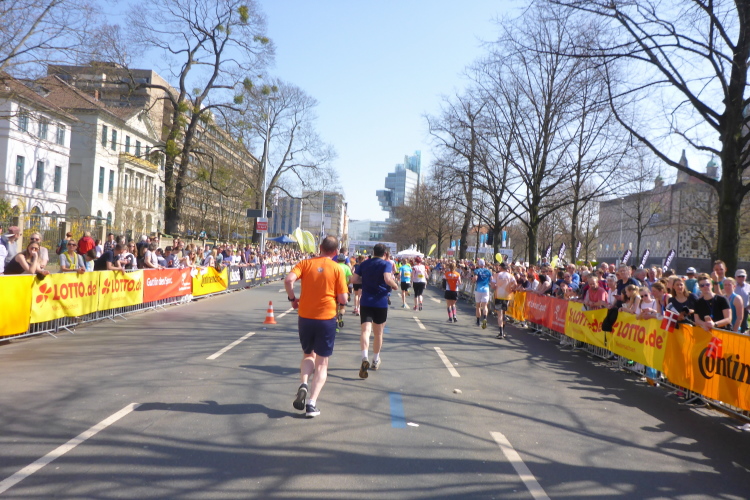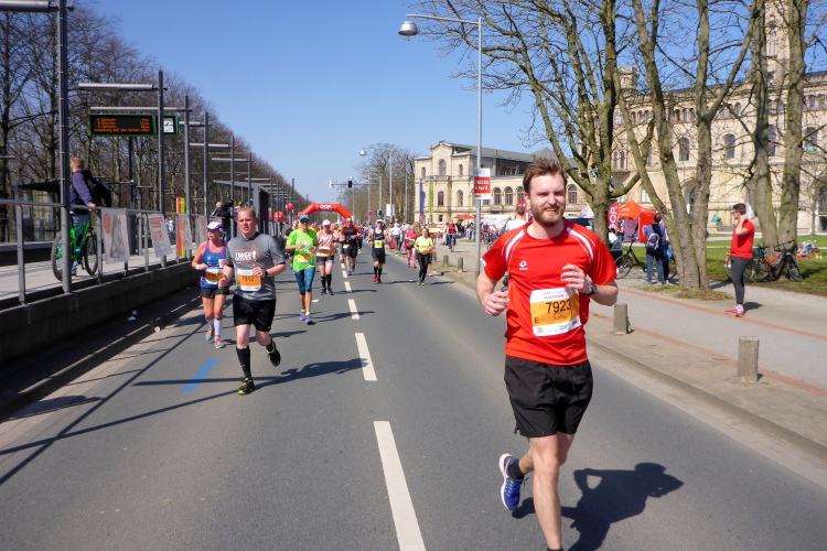 Auf der anderen Seite der Leine einige mittelalterliche Mauern und Türme. Nur die besagte Kuppel in Zielnähe kommt nicht in Sicht. Vierhundert Meter vor Ende dann Staffeltreffen. Über den ausreichend breiten Friedrichswall wuselt alles dahin. Dazwischen auch ein langsamer Läufer aus München. Hier sind gerade alle möglichen Geschwindigkeiten vertreten. Gut, dass wenigstens die Kinderläufe gestern waren. Ich gebe Gas und genieße den Zieleinlauf.