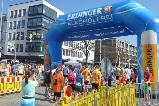 Dann auf zur Kleiderbeutelabgabe am Rathaus. Das „Massage-Museum“ im Freien ist beeindruckend groß. Ach nein: Hier gibt es zwar Massagen, aber der Schriftzug „Museum“ verweist anscheinend doch auf das dahinter befindliche Landesmuseum. Die Organisation ist wirklich perfekt. Über 20.000 Finisher werden hier ohne Probleme versorgt. Der Grohe-Duschtruck wartet auf uns. Nach Geschlechtern getrennt, so dass es bei den zahlenmäßig überlegenen Herren nur für eine kurze Erfrischung reicht.