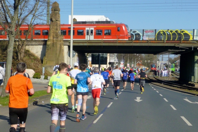 Über eine schicke Brücke queren wir den Mittellandkanal, mir bekannt aus dem Erdkundeunterricht. Schön, dass ich den auch mal live sehe. Kurz danach über eine ebenso elegante Bogenbrücke wieder zurück. Der Läufer neben mir meint zu seiner Begleiterin, dass man ja auch über den Bogen laufen könnte, was mir auch schon in den Sinn kam. Aber dieser Marathon ist einer flachsten in Deutschland. Dieses Jahr wurde die Strecke noch schneller gemacht. Es gibt nur wenige Kurven. Und die Strecke ist ein Eldorado für den Stadtbahnfreund. Meist fährt die Bahn auf eigenem Gleiskörper an uns vorbei. Alle mir bekannten und eingesetzten Baureihen habe ich schon fotografiert.