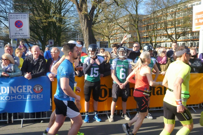 Rechts das Hannoveraner Frühlingsfest, dann - viel wichtiger - die HDI-Arena, Heimat des Fußballvereins Hannover 96. Volker, mit dem ich schon ein paar Worte gewechselt habe, fragt, ob ich es auch abgelichtet habe. Natürlich. Ein Fußballstadion am Streckenrand scheint bei einem wichtigen Stadtmarathon unverzichtbar. Ob dies für den Erhalt des IAAF-Silber-Labels notwendig ist, weiß ich nicht. Da kommt es wohl eher auf die Topläufer aus fünf Nationen, auf perfekt gesperrte Straßen und die Live-Übertragung im TV an. Das kann Hannover alles nachweisen.