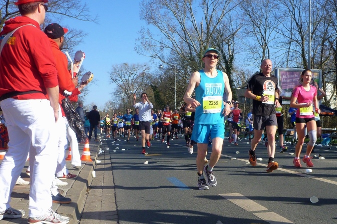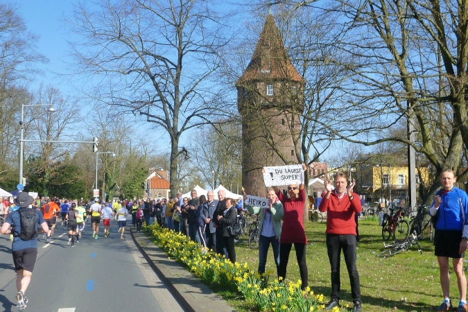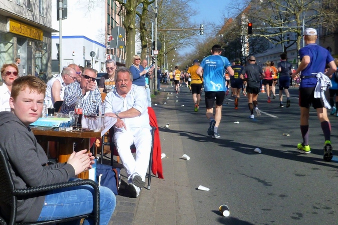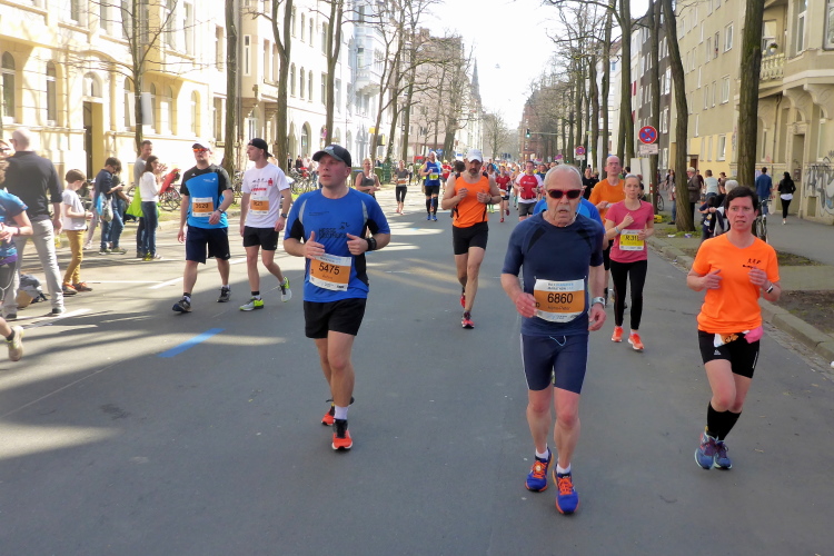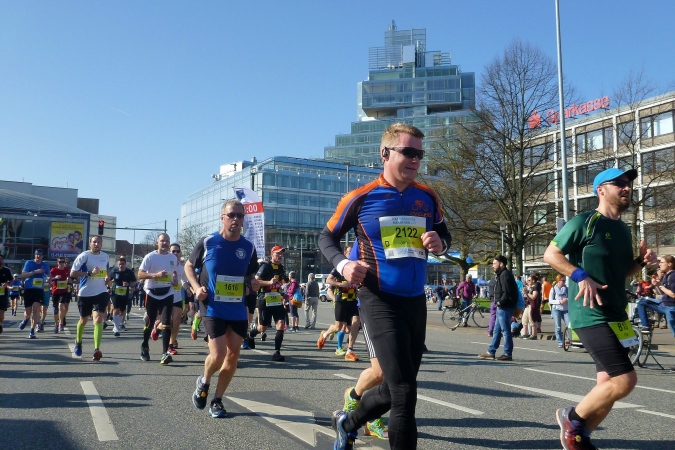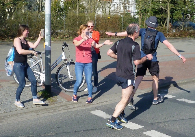 Km 27: Die Halbmarathonis gesellen sich zu uns. Leider sind die recht schnell. Die 1:45-Pacer rasen vorbei, also mit einem Kilometerschnitt von 5:00 min. Ich bin so bei 6:00 min. Außerdem ist ab hier zuschauermäßig noch mehr los. Inzwischen haben die Leute die dicken Jacken abgelegt. 200.000 werden später von der Verwaltung genannt. Und sie stehen vor wirklich schönen Häusern, netten Kneipen und Lokalen. Viele Kirchen bekommen wir zu sehen. Meist natürlich protestantisch in unterschiedlichen Ausrichtungen. Volker hat mich wieder eingeholt und zieht genüsslich vorbei. Und jetzt hätte ich seine Unterstützung doch wirklich nötig, so viel gibt es zu sehen. Zwanzig Minuten wird er vor mir im Ziel sein und das in der gleichen Altersklasse.