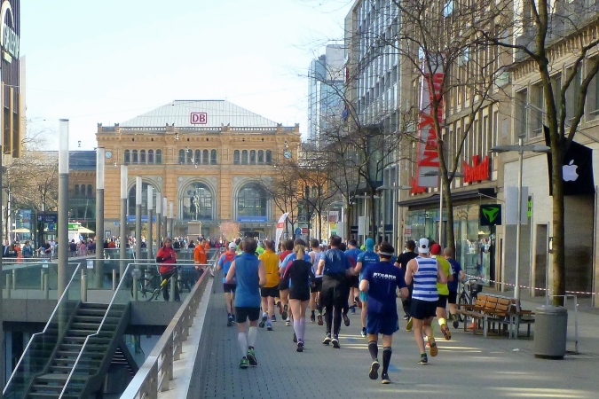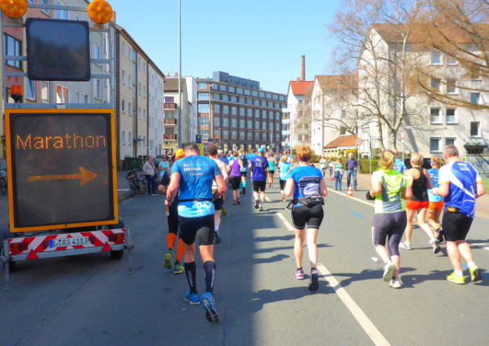 Schwungvoll gelangen wir nach sechs schnurgeraden Kilometern an den Rand der Innenstadt. Diese wurde im 2. Weltkrieg zu 90% zerstört. Einige Gebäude baute man wieder auf, generell wurde aber unter der Ägide des damaligen Stadtbaurats Rudolf Hildebrecht ein völlig neues Straßennetz angelegt. Das Ganze sollte autogerecht werden. Dem reisenden Marathonläufer fällt das nicht so auf, viele schöne Gebäude liegen an den breiten Straßen. Vor den Cafés sitzen die Einheimischen und genießen das fantastische Wetter. Dabei hatte ich in einer renommierten Zeitung gelesen, dass die Einführung von Freischankflächen vor vielen Jahren für Kontroversen und Kopfschütteln sorgte. „Der Hannoveraner sitzt nicht auf der Straße, merken Sie sich das“, soll ein älterer Herr seinerzeit auf einer Diskussionsveranstaltung ausgerufen haben. Stimmt. Der Hannoveraner tanzt auf der Straße.