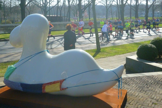 Rechtskurve, die Kuppel des Rathauses ist in der Ferne zu sehen. Noch 1,3 km liegen vor uns. Skulpturenmeile heißt das hier. Links daher auch die netten „Nanas“ Sophie, Charlotte und Caroline, benannt nach Kurfürstin Sophie, Charlotte Buff, dem Vorbild der „Lotte“ in Goethes „Werther“-Roman, und der Astronomin Caroline Herschel. Die voluminösen Frauenkörpern nachempfundenen Figuren, 1974 kreiert von der Künstlerin Niki de Saint Phalle und wegen ihrer bunten Farbgestaltung einst umstritten, gehören inzwischen längst zu den begehrtesten Fotomotiven im Straßenbild der Stadt.