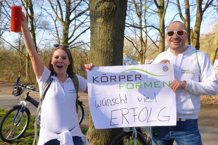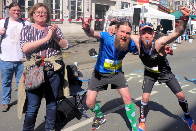 Max ist mit Begleiterin und Begleiter sowie zwei Luftballons in Form der Ziffern 5 und 4 unterwegs. Er legt Wert darauf, dass er heute 45 Jahre alt wird – und nicht etwa 54. Na dann viel Spaß beim Lauf und das mit der 54 wird er sicher noch oft zu hören bekommen.