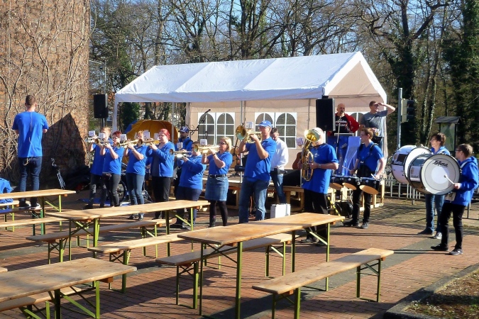 Ein geschmückter Weihnachtsbaum. Ewig gestrig oder schon vorausschauend? Ich „habe fertig“, rechne noch ein bisschen wegen der Zielzeit herum, aber es will nichts Vernünftiges dabei herauskommen. Der Kopf versagt seinen Dienst. Einfach genießen. Ich sehe ein blondes Ritterfräulein, das mich anfeuert. Judith wird derweil von einem verkleideten Standbetreuer zu einem Tänzchen aufgefordert. Schöne Brücke über die Leine.