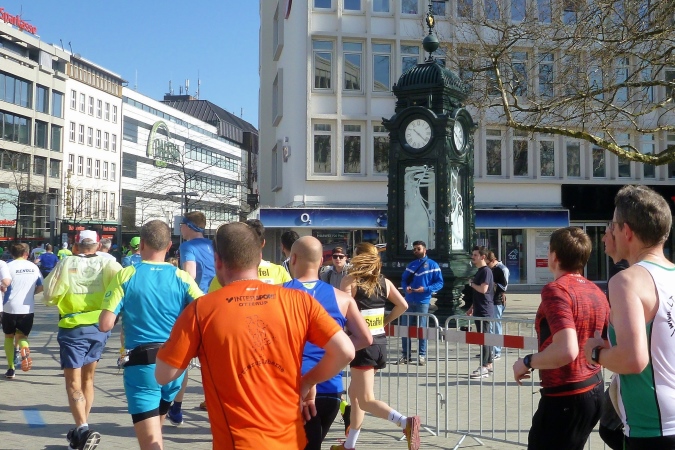 Kröpcke heißt der zentrale Platz der Stadt, benannt nach dem seit 1870 bestehenden Café. Wahrzeichen ist eine Uhr, die der Architektur des Cafés angepasst ist und ursprünglich als Wettersäule mit meteorologischen Instrumenten gedacht war, später aber multifunktional auch als Zeitmesser und Ausstellungsvitrine genutzt wurde. Nach wechselvoller Geschichte ist das heutige Exemplar ein Nachbau des Originals. Da muss ich mal einige Fotos machen. Wo ist Judith? Ein Läufer ruft mir zu, dass sie vor mir sei. Er weiß auch, dass ich der Andreas bin. Nein, ich kenne ihn nicht. Aber er ist gerne auf Marathon4you.de und kennt sich aus. Da bin ich richtig stolz, und er ist schon wieder auf und davon.