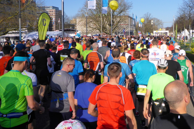 Um 8:45 Uhr starten Handbiker und Skater. 15 Minuten später geht es blockweise für uns los. Das IAAF- Silber-Label verspricht gute Organisation und natürlich schnelle Top-Läufer. Auch die Deutsche Halbmarathon-Meisterschaft findet heute statt. Daher wird mehr denn je auf die Einhaltung von Regeln geachtet. Sogar die örtliche Zeitung veröffentlicht nennt noch mal Gründe, die zu einer Disqualifikation führen können. Ich muss heute also besonders aufpassen, dass ich zum Fotografieren den Laufweg nicht verlasse. Aber so eng wird das bei den hinteren Blöcken sicher nicht gesehen.