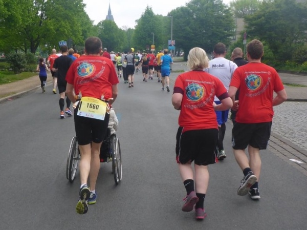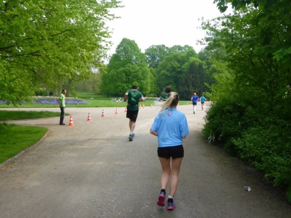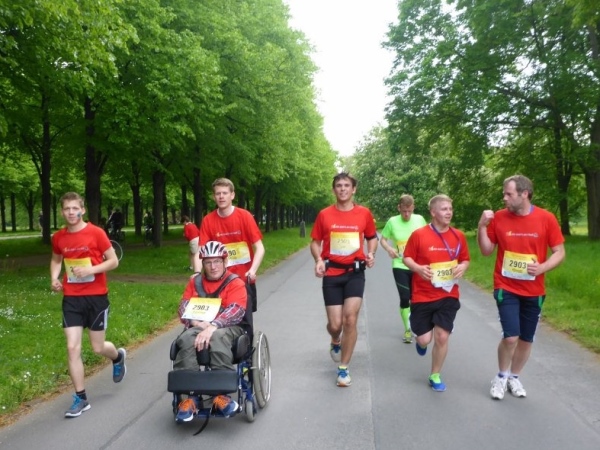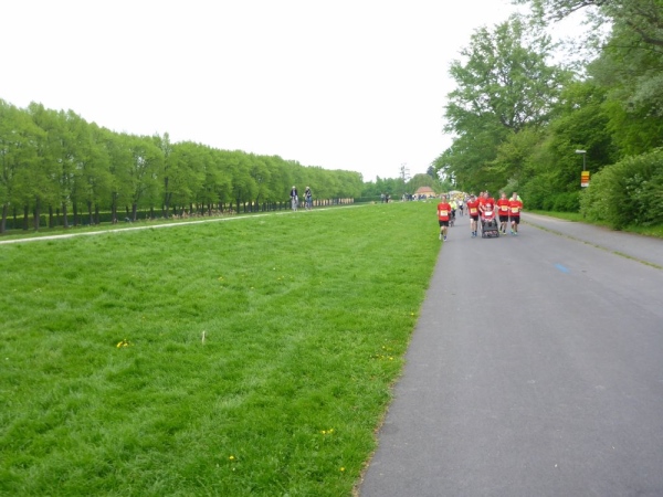 Als ich die Herrenhäuser Gärten umrunde, fällt mir erneut eine Rollstuhlstaffel auf. „Wir dreh’n am Rad!“ steht auf der T-Shirt-Rückseite der Läufer. Erneut bewundere ich das soziale Engagement vom Jugendrotkreuz.