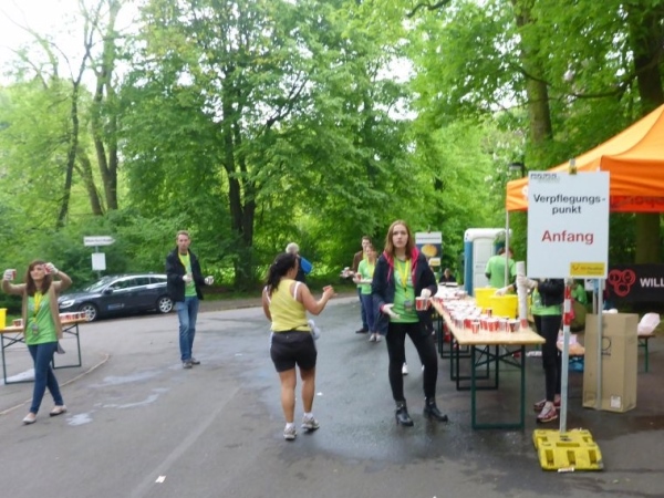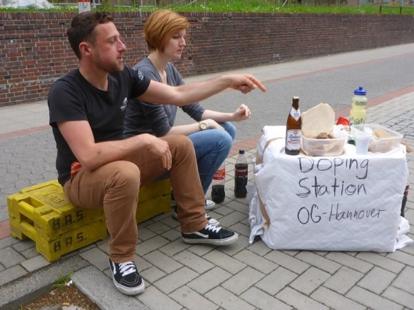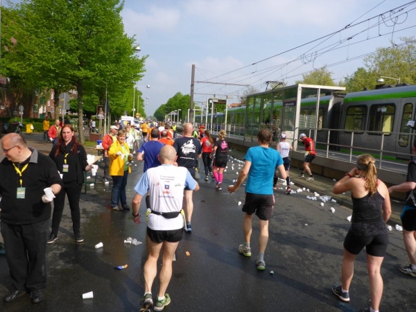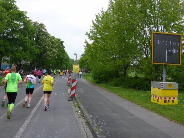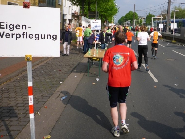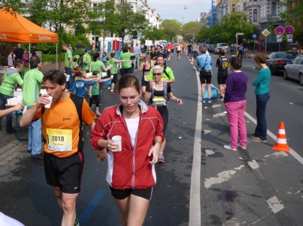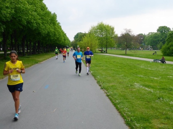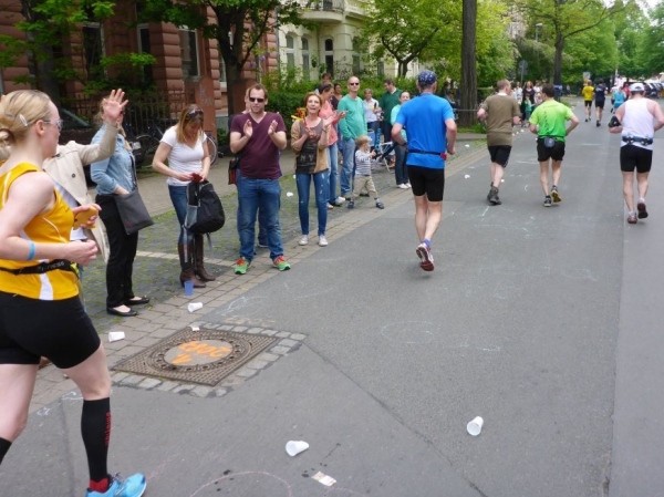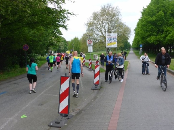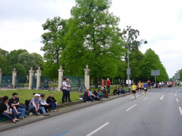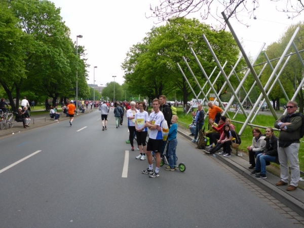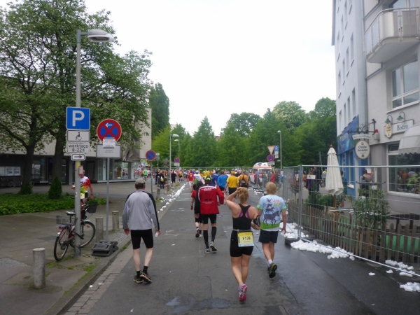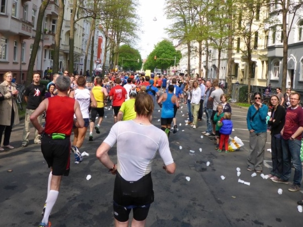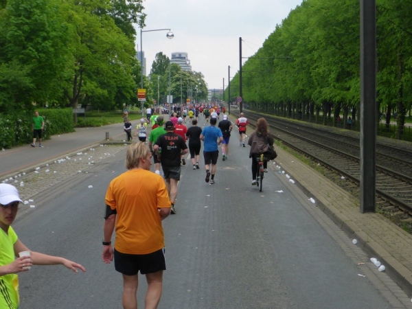 Wie vor vier Jahren, so hat sich glücklicherweise auch heute nicht viel geändert: in Herrenhausen und Nordstadt werden die Läufer von den Studenten frenetisch gefeiert! Am Straßenrand werden an einer „Dopingstation“ sogar eine bestimmte Sorte Kekse angeboten. Man will mir welche reichen, ich lehne lachend ab. Am elften Erfrischungspunkt trinke ich zwei Becher Cola und blicke wie beiläufig auf die gegenüberliegende Seite der Herrenhäuser Allee rüber. Beinahe hätte ich mich verschluckt: dort erblicke ich eine endlos lange Traube von Marathonis, die die gesamte Länge des Georgengartens entgegengesetzt zurück lief. Vage erkenne einen gelben Ballon…vermutlich die 4h:15. Diese endlos lange Traube, ein krasser Anblick.