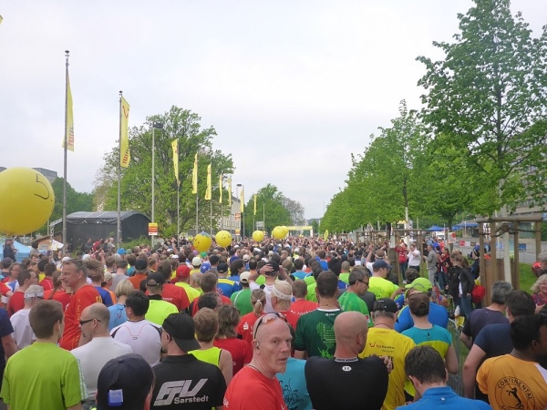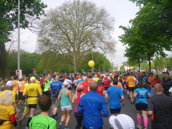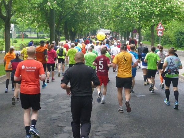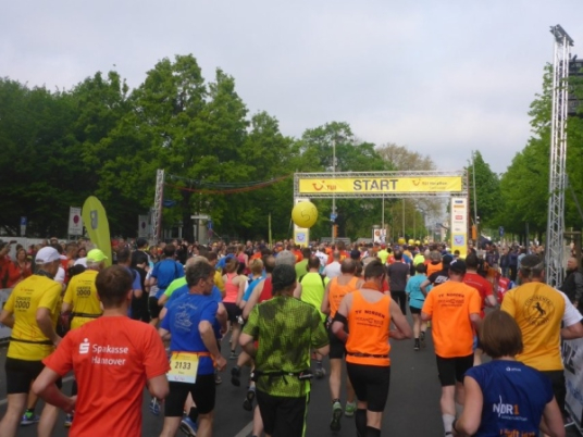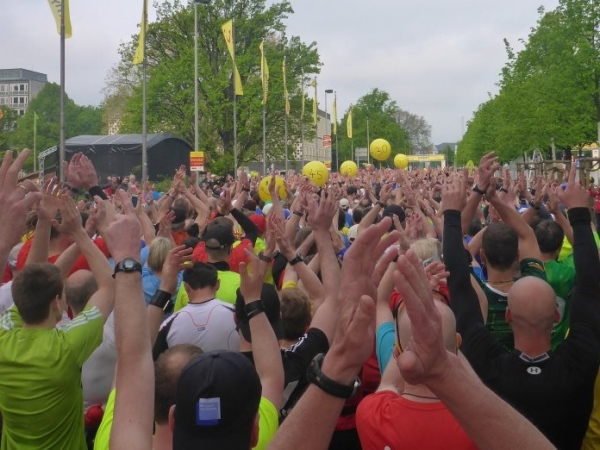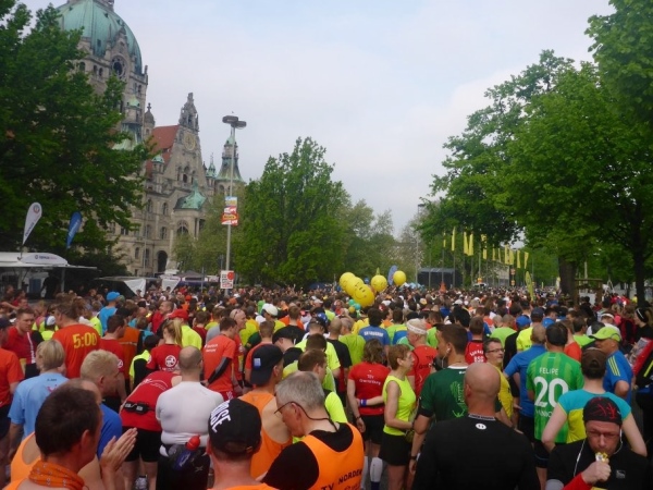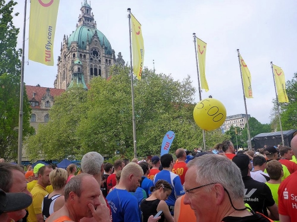 Draußen schwillt derweil die Geräuschkulisse an. Als ich mich aus dem engen Kabuff wieder ins Freie kämpfe, frische Marathonluft einatme und in die Startbahn der riesigen Läuferschlange einreihe, höre ich auch schon die Stimme des Moderators: „Hebt alle eure Hände! Hannover…seid ihr bereit?“. Die Stimmung kocht! In einiger Entfernung vor mir sehe ich die gelben Ballons der grell gekleideten Pacemaker, die Finisher-Zeit „5:00“ scheint mir nicht gerade zum Greifen nahe. Ein kurzer Schulterblick, kaum Läufer in meiner Nähe. Dahinter ist die Startbahn so leer wie die Taschengeldbörse meiner Tochter. Irgendwie erinnert mich die ganze Szenerie gerade wieder an meinen nächtlichen Traum. Ich an allerletzter Stelle? Unvorbereiteterweise ertönt Jubel, langsam setzen sich viele hundert Läufer in Bewegung.