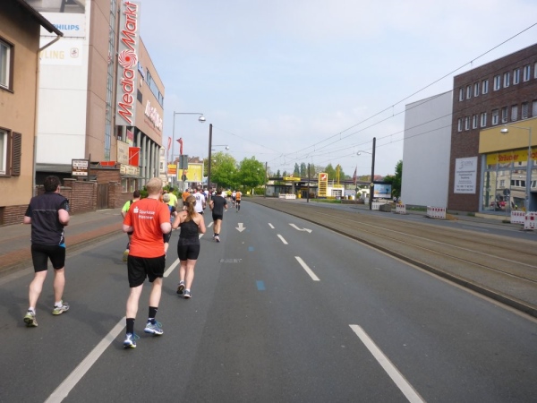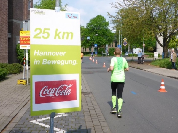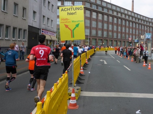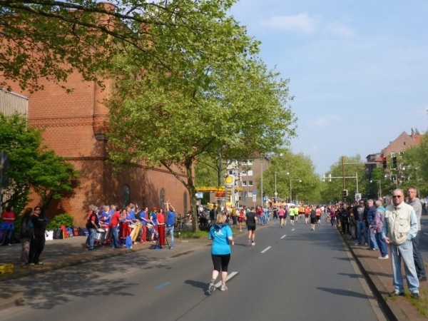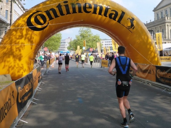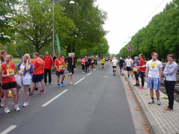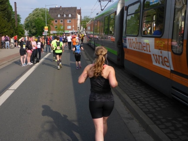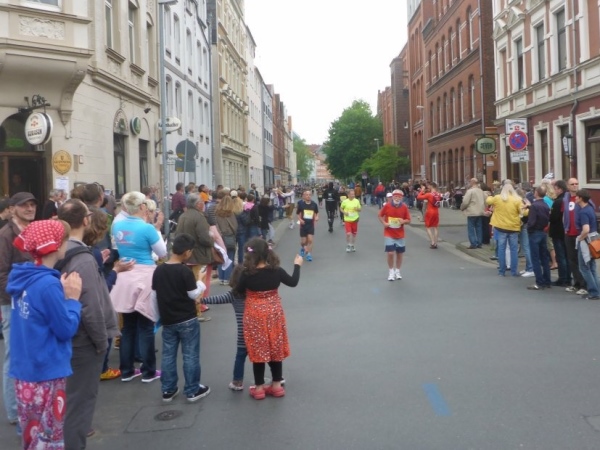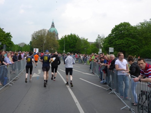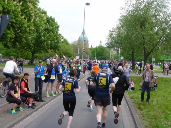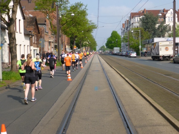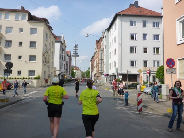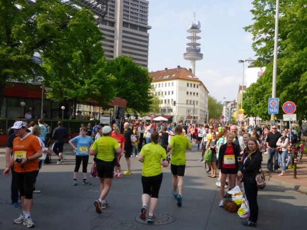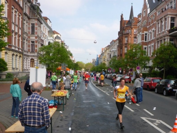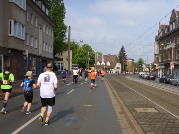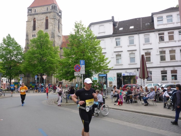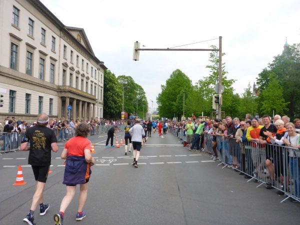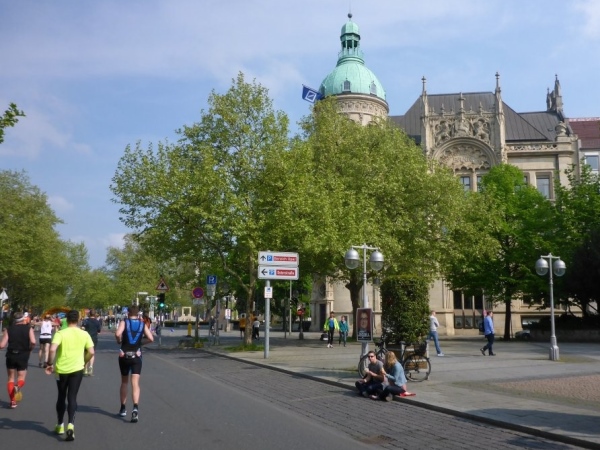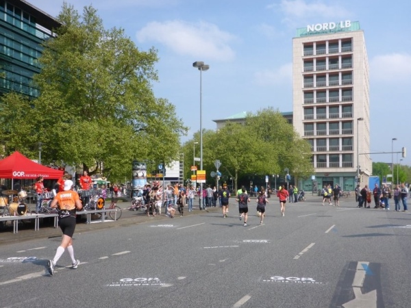 Ein Wahnsinn, diese endlose Gerade durch die Südstadt Richtung Zentrum, vorbei an Döhrener Turm und Gilde-Brauerei. Die Begeisterung der Zuschauermenge entlang der Hildesheimer puscht zusätzlich, ich kann mein Tempo im 6er Schnitt halten. Ein Erfrischungspunkt taucht auf, ich lösche meinen Durst. Währenddessen blicke ich nach oben. Der anfänglich graue Schleier wird durch weiße Wolken und strahlend blauem Himmel ersetzt. Ich begrüße die Sonnenstrahlen, es wird zunehmend wärmer.