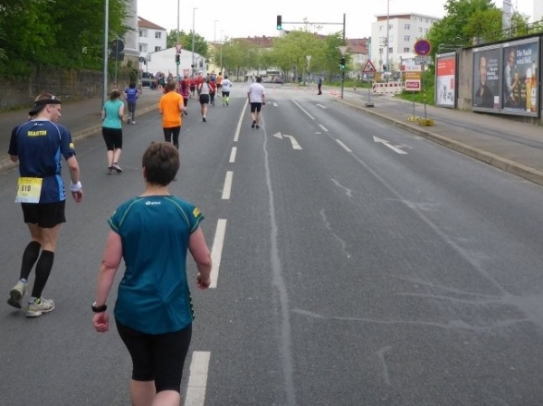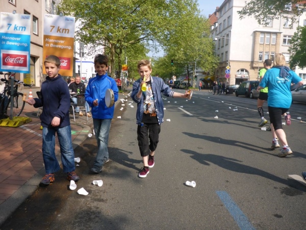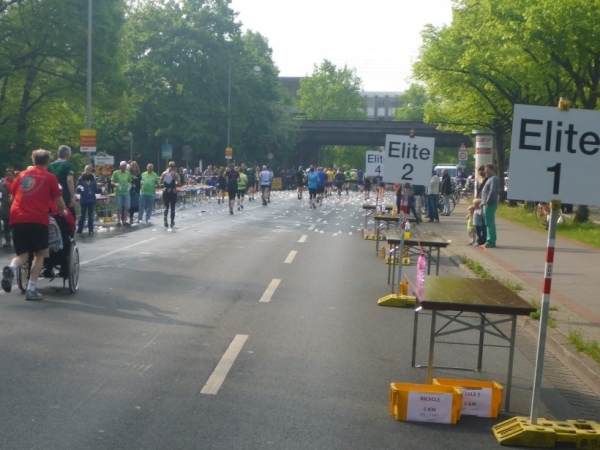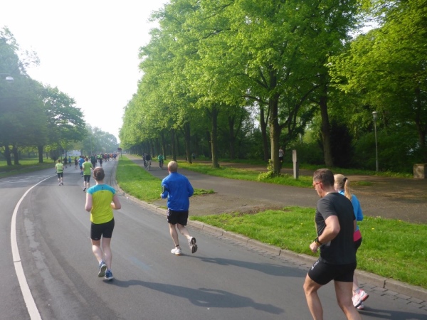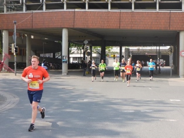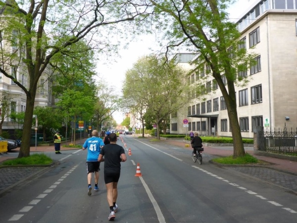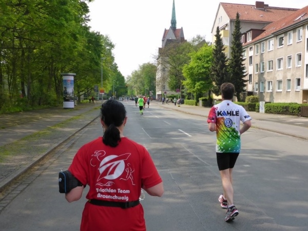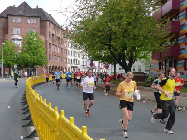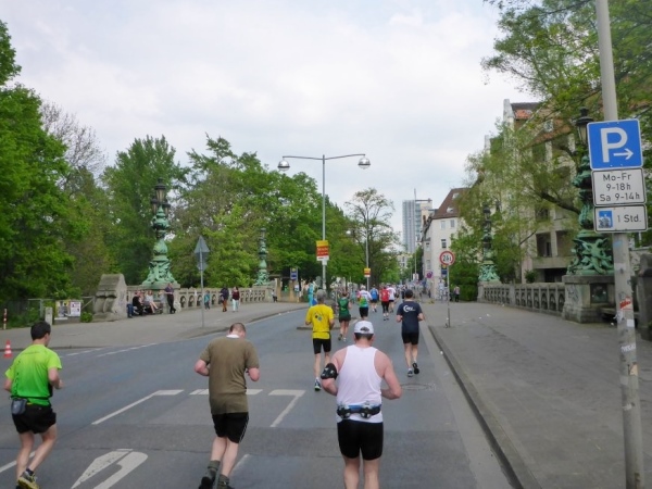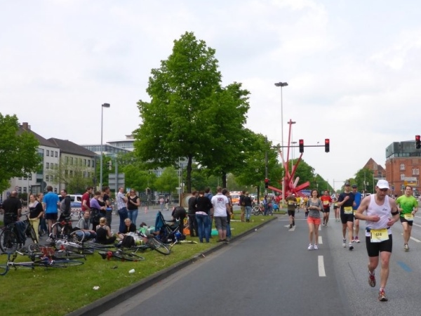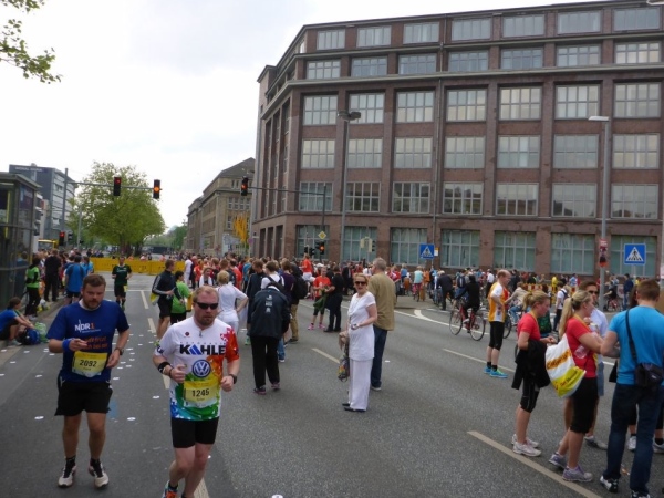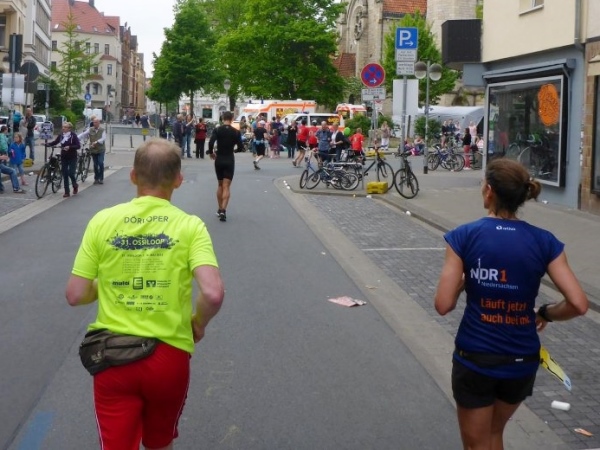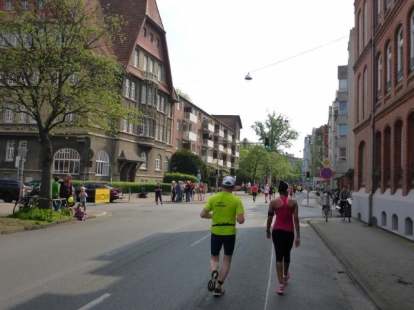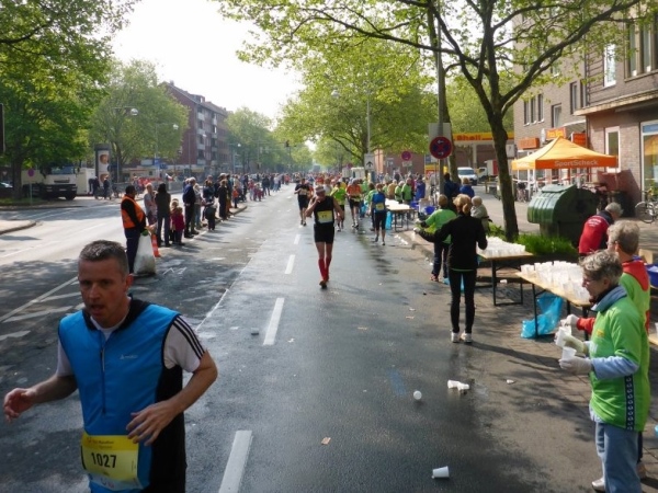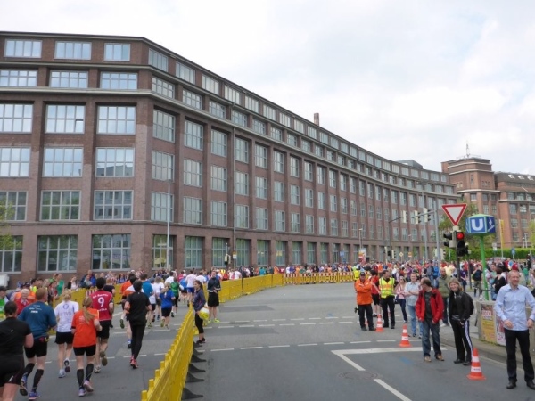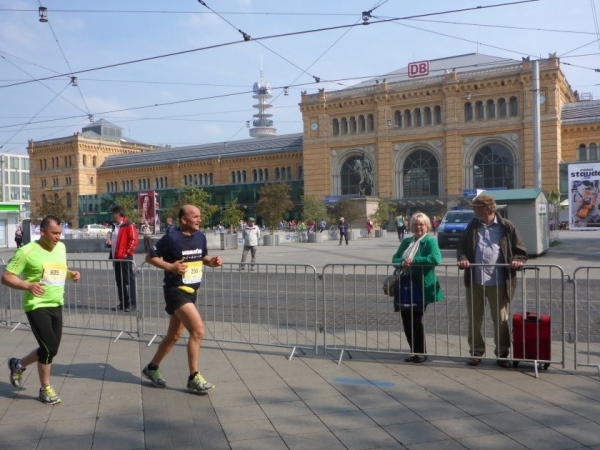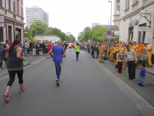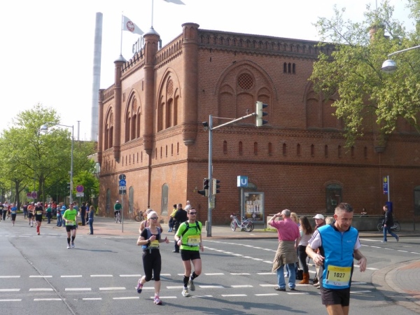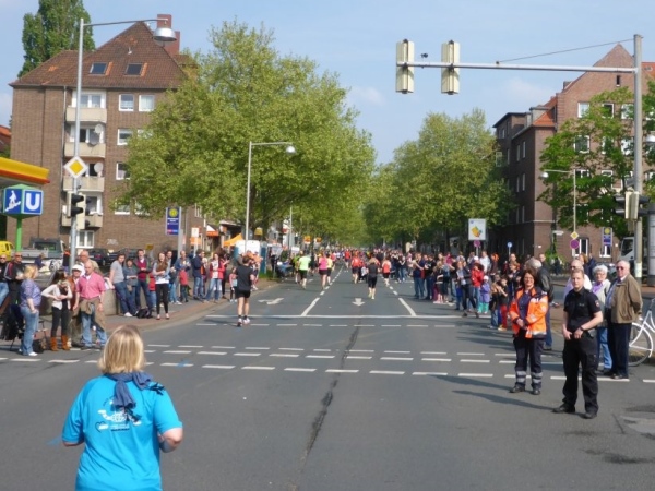 Ein Wahnsinn, diese endlose Gerade durch die Südstadt Richtung Zentrum, vorbei an Döhrener Turm und Gilde-Brauerei. Die Begeisterung der Zuschauermenge entlang der Hildesheimer puscht zusätzlich, ich kann mein Tempo im 6er Schnitt halten. Ein Erfrischungspunkt taucht auf, ich lösche meinen Durst. Währenddessen blicke ich nach oben. Der anfänglich graue Schleier wird durch weiße Wolken und strahlend blauem Himmel ersetzt. Ich begrüße die Sonnenstrahlen, es wird zunehmend wärmer.