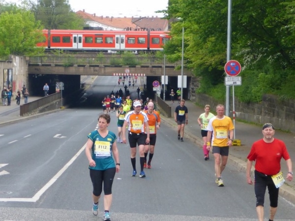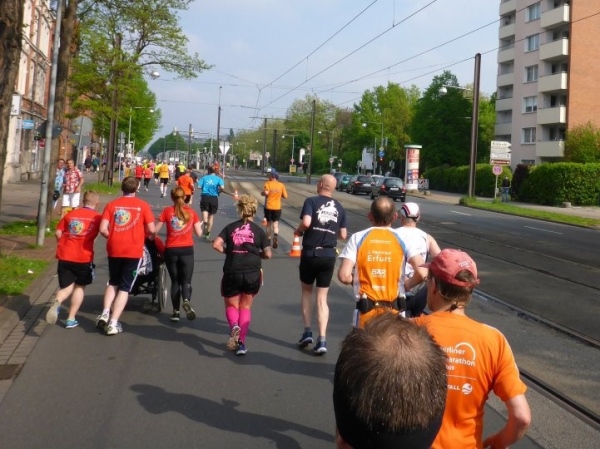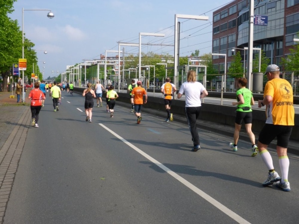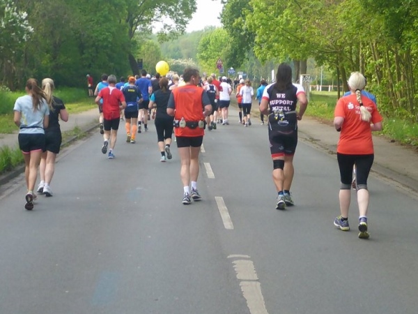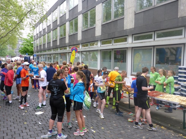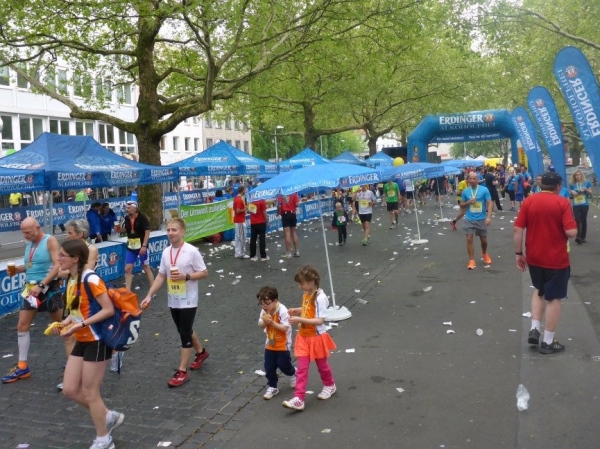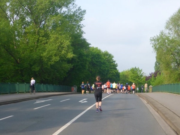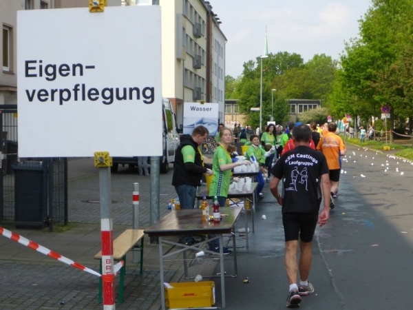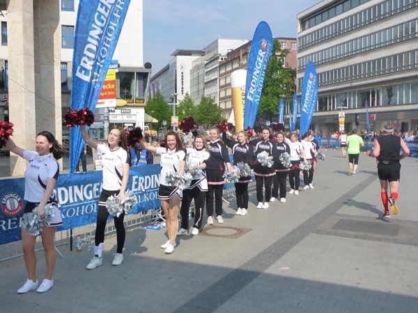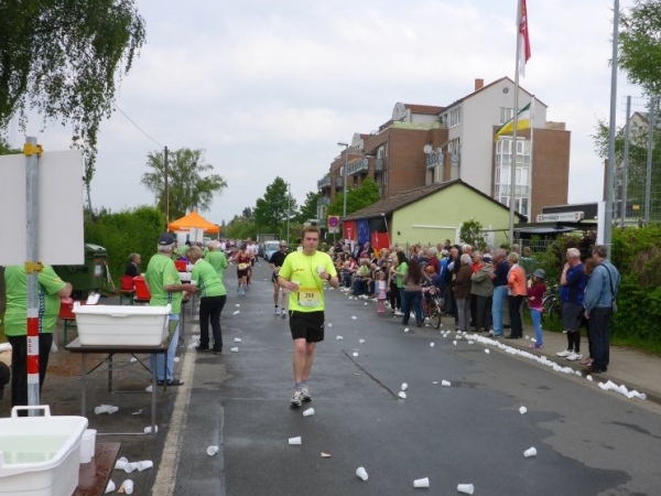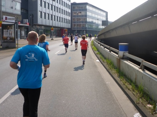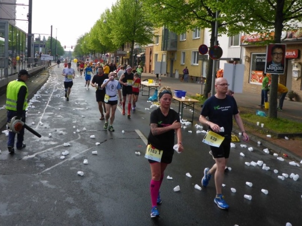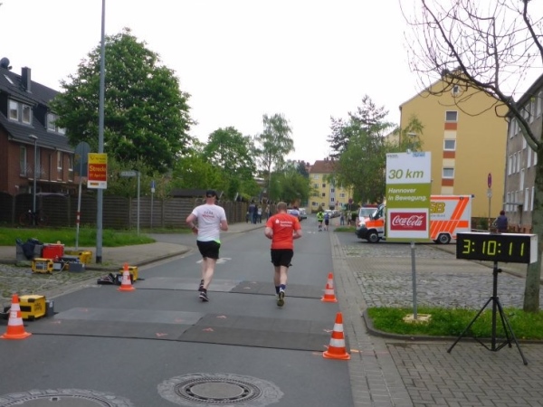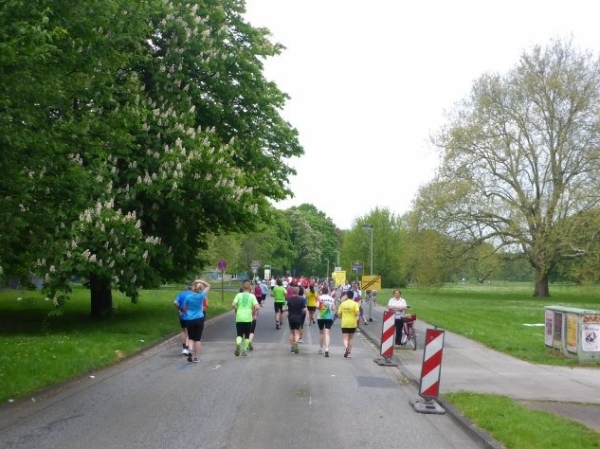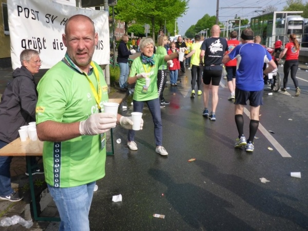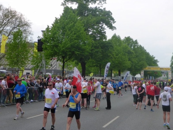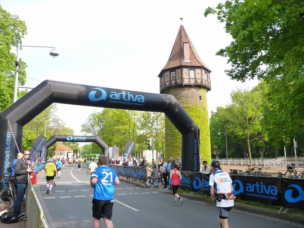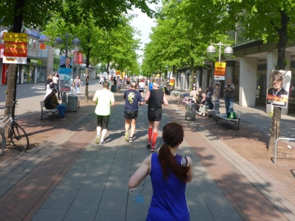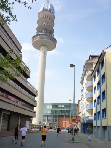 Ein Wahnsinn, diese endlose Gerade durch die Südstadt Richtung Zentrum, vorbei an Döhrener Turm und Gilde-Brauerei. Die Begeisterung der Zuschauermenge entlang der Hildesheimer puscht zusätzlich, ich kann mein Tempo im 6er Schnitt halten. Ein Erfrischungspunkt taucht auf, ich lösche meinen Durst. Währenddessen blicke ich nach oben. Der anfänglich graue Schleier wird durch weiße Wolken und strahlend blauem Himmel ersetzt. Ich begrüße die Sonnenstrahlen, es wird zunehmend wärmer.