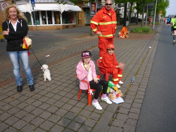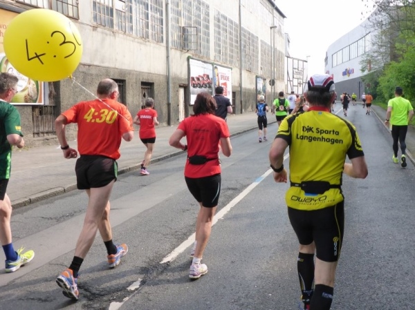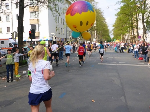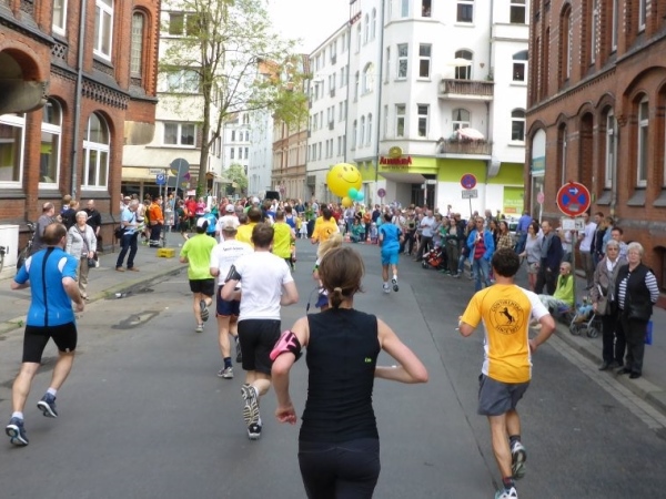 Dann geht es erneut über die Leine zurück Richtung Döhren. Ich lasse den Ballon mit der Aufschrift 4h:30 hinter mich…kurz bevor ich mit der Hildesheimer Straße die so ziemlich längste Streckengerade des Marathons in Angriff nehme. Zwei kleine Mädels strecken mir die Hand entgegen, wollen, dass ich abklatsche. Als ich mich Ihnen nähere, ruft mir eine der Beiden keck zu: „Aber wehe, Du hast Schweißhände! Bääh!“