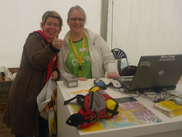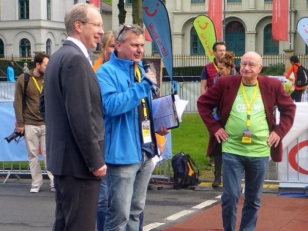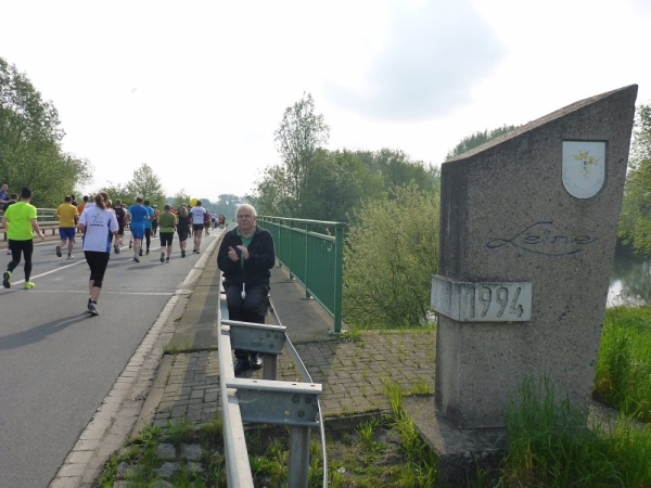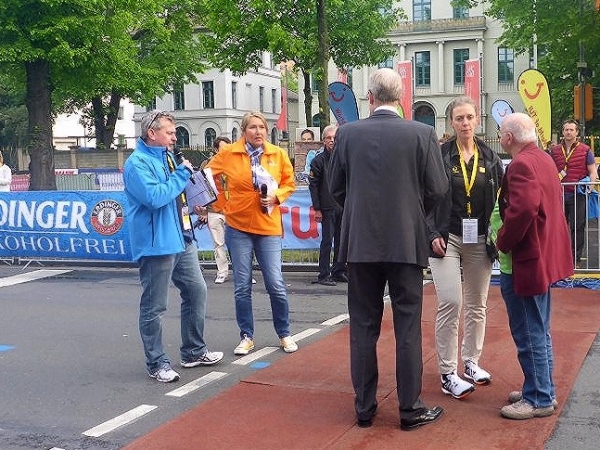 Im hinteren Teil des Zelts drücke ich den netten Damen Britta und Simone von Mika-Timing meine Meldebestätigung in die Hand. Als ich ein bekanntes Gesicht im Zelt sehe, muss ich unweigerlich grinsen. Vielläufer Heiner Schütte hatte ich bei der gestrigen Harzquerung ebenfalls getroffen. Gerade verteilt er Flyer für den 2. Schloss Marienburg Marathon 2015. Am Zelteingang dann die zweite Begegnung: Ein drahtiger Herr mit Presseausweis lächelt mich an. „Hallo Mario, schön, dass wir uns mal persönlich kennen lernen“, spricht mich Klaus Duwe an, Chefredakteur von Marathon4you. Wir unterhalten uns angeregt über meine gestrige Harzquerung, anschließend wünscht er mir viel Spaß beim zweiten Teil meines Doppeldeckers-Laufs.