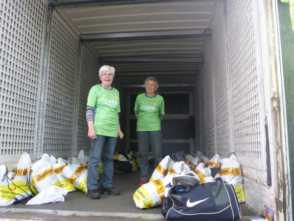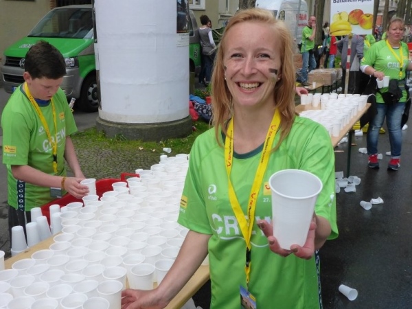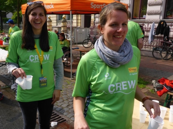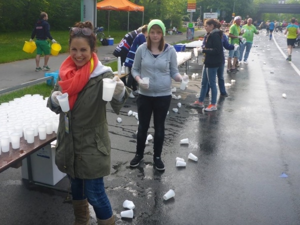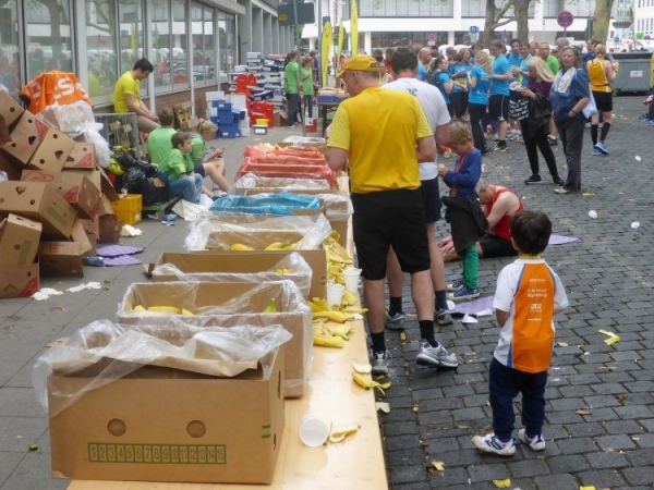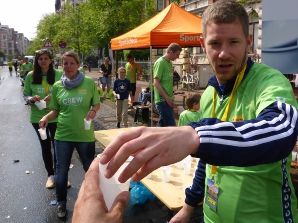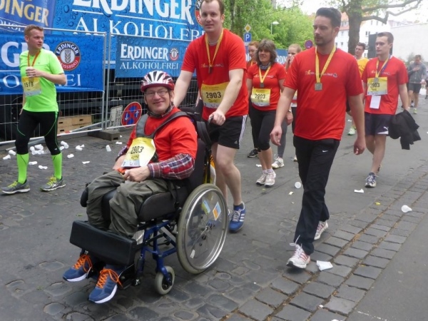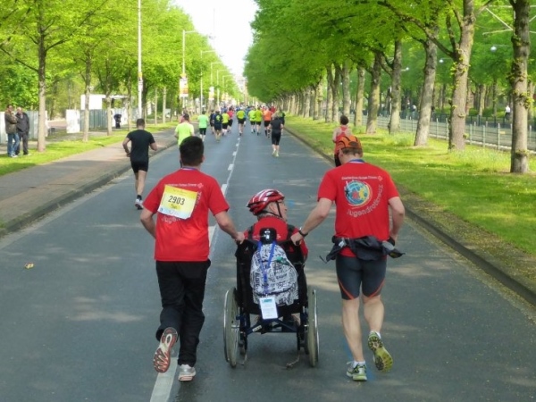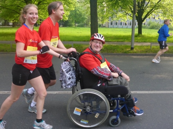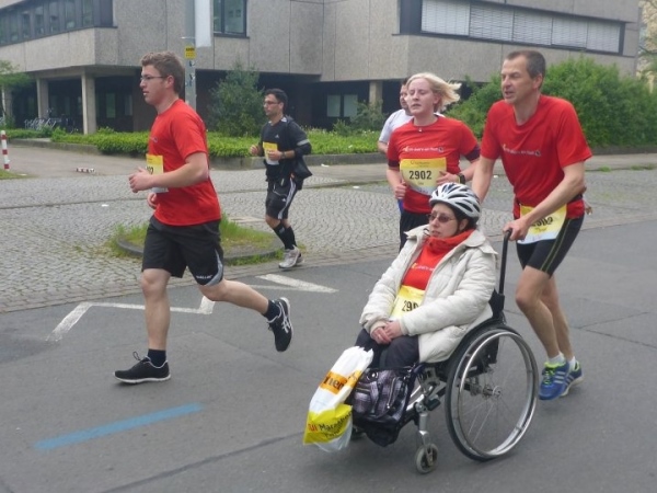 Erstaunt entdecke ich, wie ein Rollstuhlfahrer von zwei jugendlichen Rotkreuzlern durch den Läuferstrom geschoben wird. Später beobachte ich, wie sich alle paar Kilometer die Läufer Staffelweise hinter den Rollstühlen abwechseln.