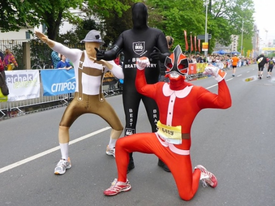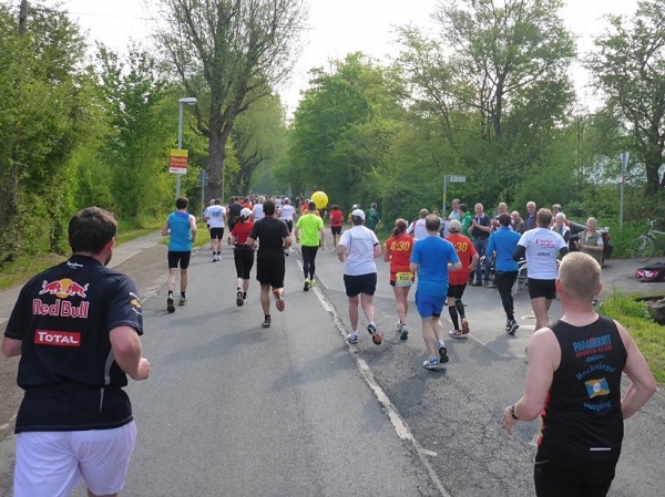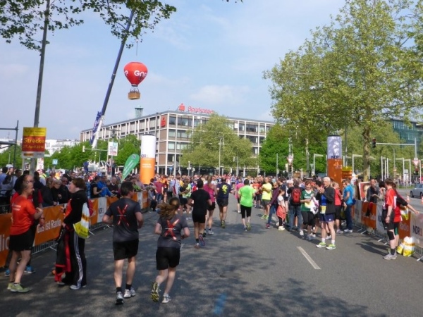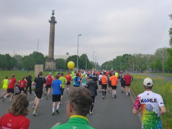 Nach gut einem Kilometer feiere ich zusammen mit Siegesgöttin Victoria meinen ersten Teilerfolg, als ich an dem Ballon mit der Zeit 5h:00 vorbeilaufe. Es scheint, als wolle mir die nette Lady aus knapp fünfzig Meter Höhe noch einen Lorbeerkranz hinterherwerfen, aber ich winke dankend ab. Hinter mir entfernt sich die Waterloosäule zusehends.