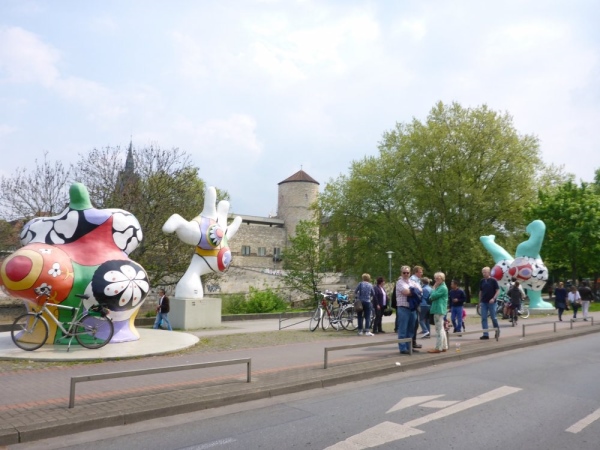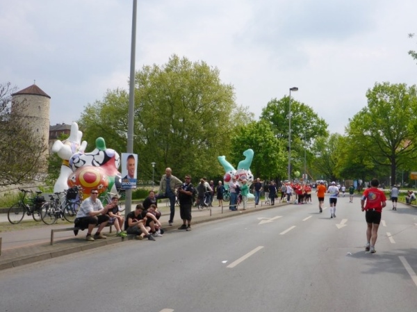 Am Leibnizufer der Leine passiere ich die drei Nanas der französischen Künstlerin Niki de Saint Phalle sowie Leineschloss. Ich will nur noch ins Ziel und dort irgendwo in Ruhe schlafen. Am Horizont ragt das stählerne Hochhaus der NordLB mit den markant versetzten Blöcken in den Himmel, aber ich habe meinen Tunnelblick extra für den Zieleinlauf aufgespart. Hier stehen die Zuschauer reihenweise Spalier, ich bin einmal mehr schwer beeindruckt von den Hannoveranern. Ein Akkustik-Tsunami aus Jubelschreien schlägt mir entgegen.