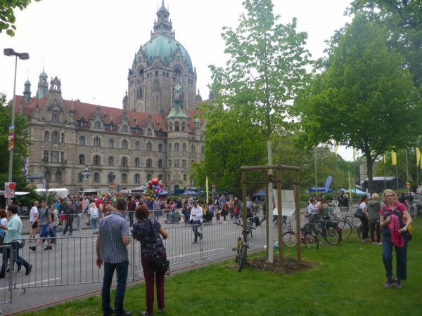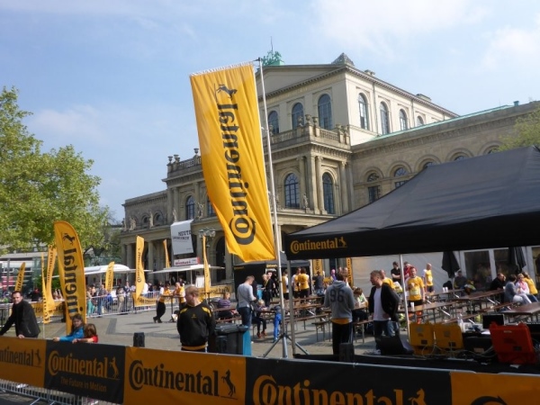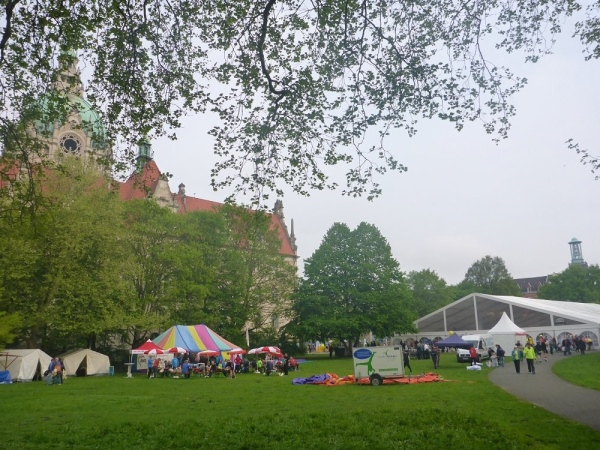 Der Zug hält in Hannover, ich schlendere gemütlich durch den Hauptbahnhof und folge zwischen all den Absperrungen einer Gruppe von Gleichgesinnten. Wenig später befinde ich mich schon auf dem Veranstaltungsgelände, welches rund um das Neue Rathaus errichtet wurde. Aus zeitlichen Gründen bin ich gezwungen, die Startunterlagen am Veranstaltungstag abzuholen, also peile ich das Marathon-Messezelt auf dem Trammplatz an. Sowohl regionale als auch nationale Austeller aus den Bereichen Fitness, Gesundheit, Sport und Touristik laden hier erneut zum Shoppen ein.
