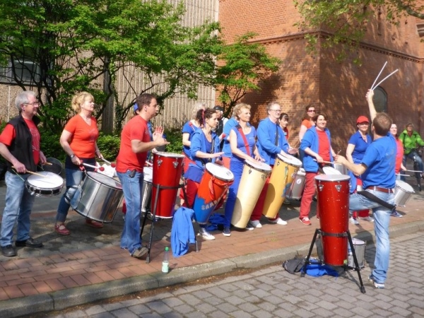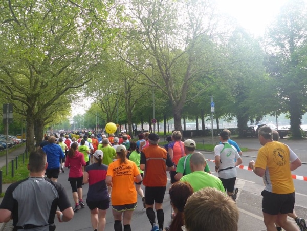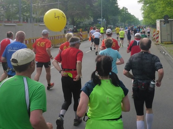 Es bleibt keine Zeit, bereits jetzt schon an die ungeheuer lang wirkende Marathondistanz nachzudenken. Wir passieren Schützenplatz, Sprengel-Museum und Maschsee. In regelmäßigen Abständen werden die Läufer mit Sehenswürdigkeiten belohnt. Die Lauffreude kann ich in den Gesichtern ablesen, dieser Tag verspricht herrlich zu werden. Und dann sehe ich den nächsten Ballon mit der 4h:45. Na also, alles paletti. Ich überhole die Pacemaker-Gruppe, drehe mich kurz um und drücke den Auslöser meiner Kamera. Der erste VP kommt nach vier Kilometern in Sichtweite. Dankbar nehme ich den Wasserbecher von der freundlich lächelnden Helferin entgegen.