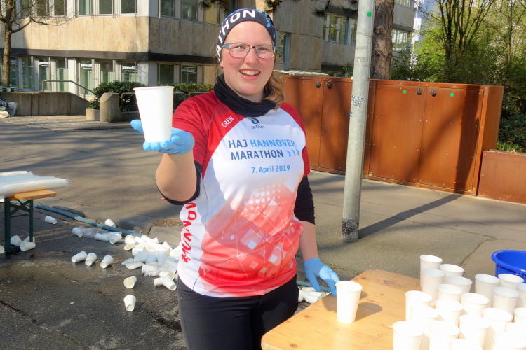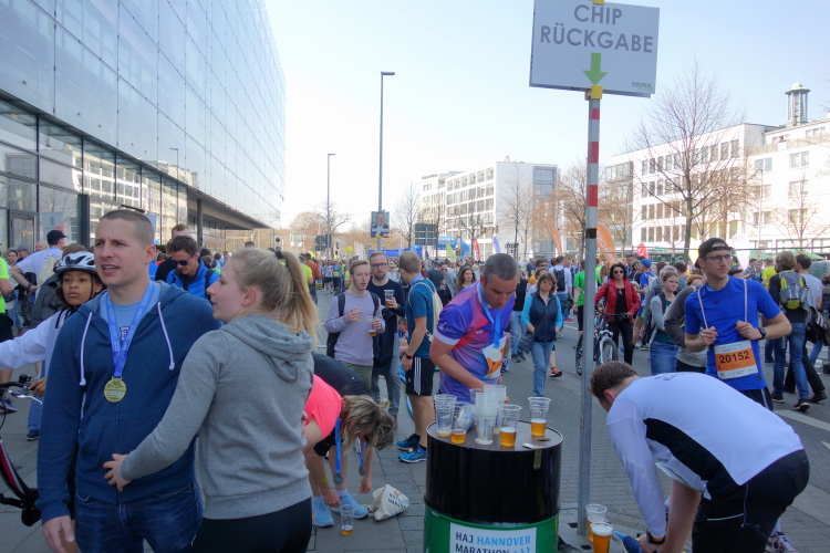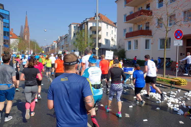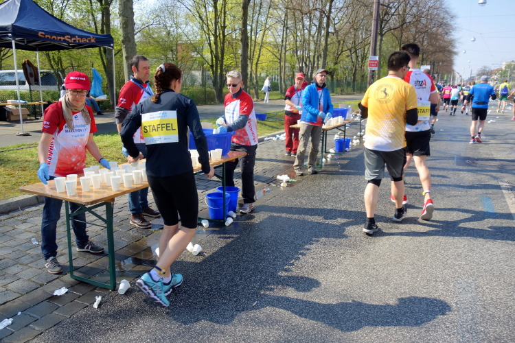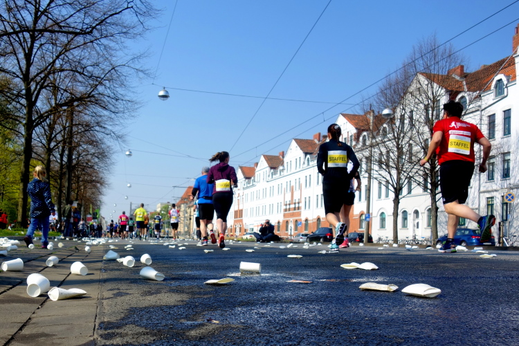 Wir laufen nun zurück in Richtung Oststadt. Hier knallen dir die Bässe nur so um die Ohren! Mit viel Sound werden Teilnehmer und Zuschauer unterhalten. Der achte Erfrischungspunkt auf der Podbie hat seine Pappbecher-Schlacht wohl noch nicht hinter sich. Nennenswert an dieser Stelle: Rund 350.000 Pappbecher werden an den VP's und im Zielbereich befüllt,  ausgegeben und wieder eingesammelt.