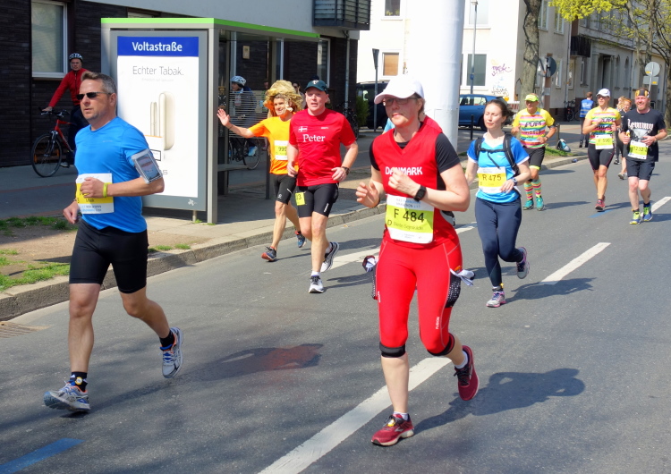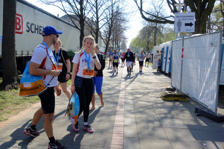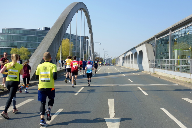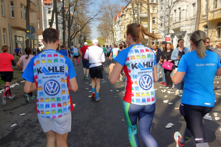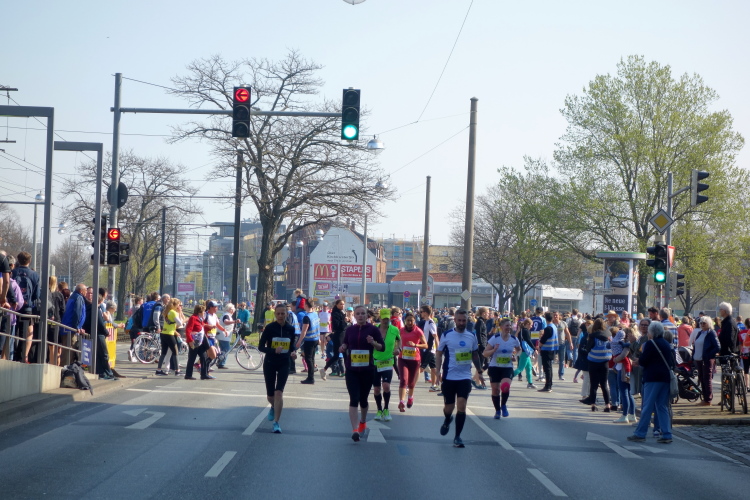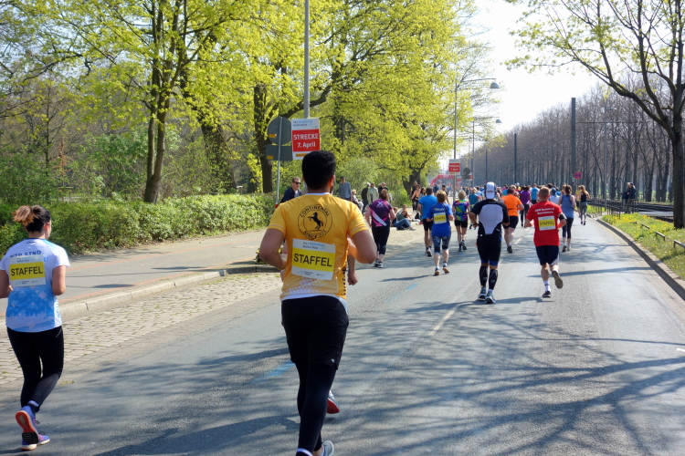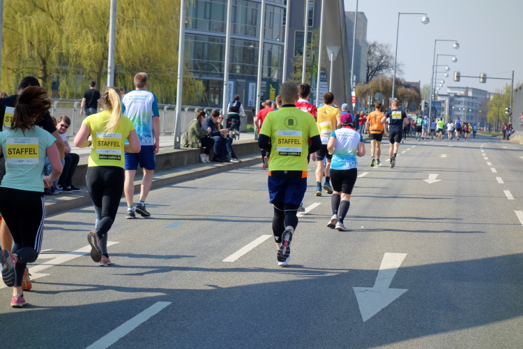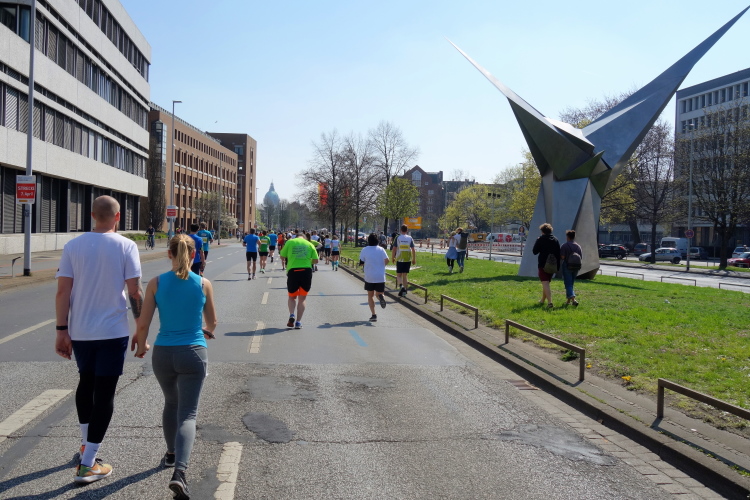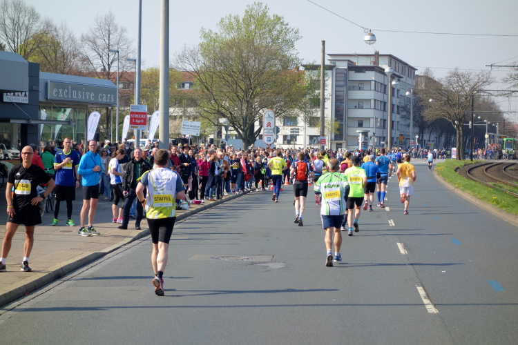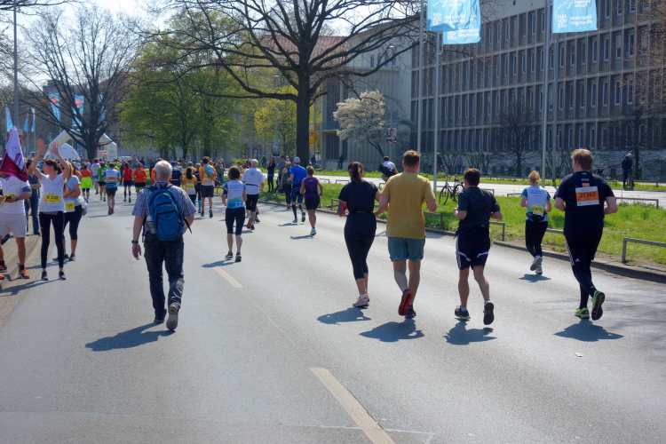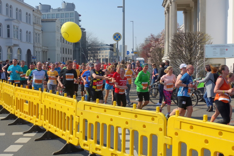 Kaum reihe ich mich im allerletzten Block ein, fällt auch schon der Startschuss. Das nennt man wohl durchdachtes Timing. Kurzes Wiedersehen mit Thomas in Block D. Sieh mal einer an, ist er also doch nicht disqualifiziert worden, denn ein neuer Zeitchip ziert seine Schlappen. Meine Frau startet heute eine Stunde später, denn sie beteiligt sich an der Marathon-Staffel ihrer Firma. Eine solche Staffel besteht aus zwei bis sechs LäuferInnen, die sich die Marathon-Strecke auf verschiedenen Distanzen zwischen 5,5 und 9,2 km teilen. Reihenfolge und Einteilung ist den Staffeln überlassen. Für den gemeinsamen Zieleinlauf können alle Läufer einer Staffel abschließend auf Ihre letzten Läufer warten, um die letzten Meter gemeinsam zu absolvieren. Ich würde sie später bei Wechselzone Emmichplatz (km 27,3) wiedersehen.