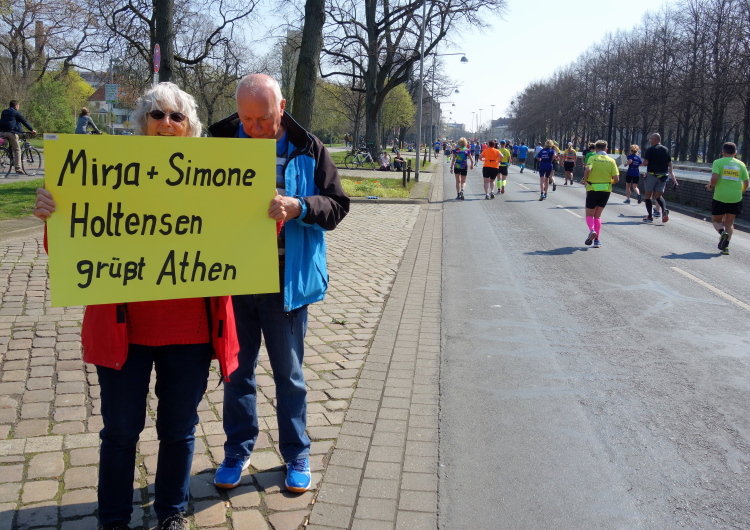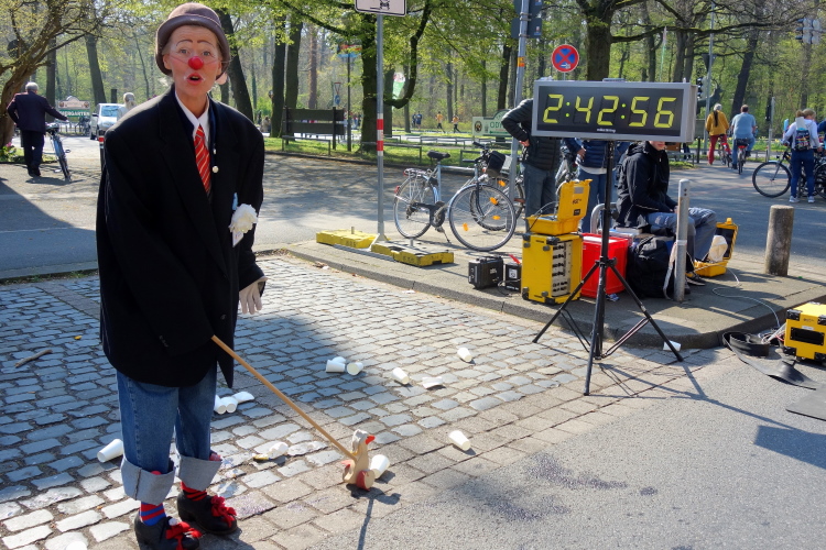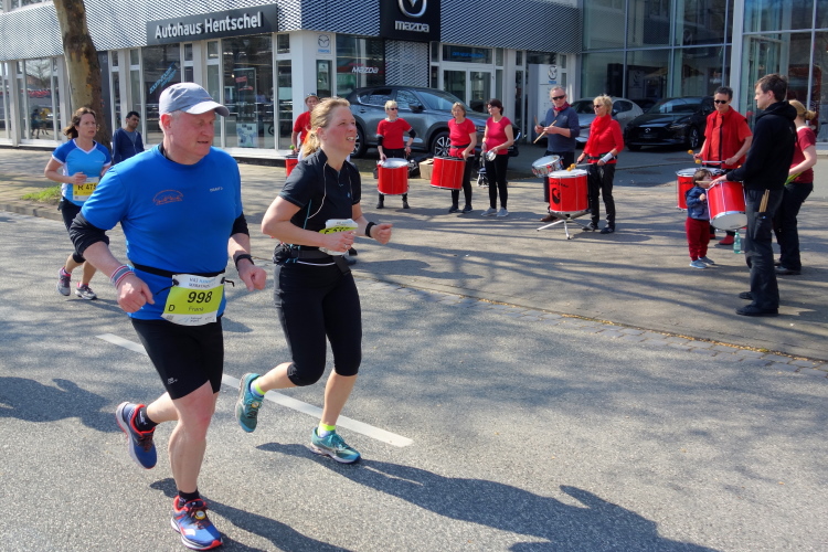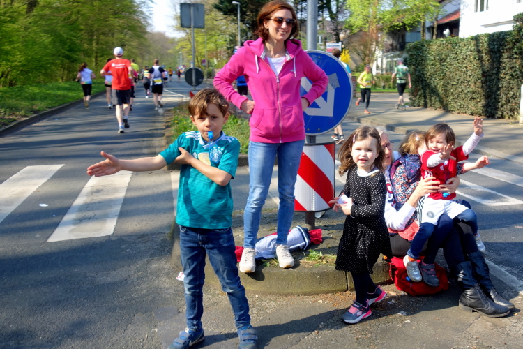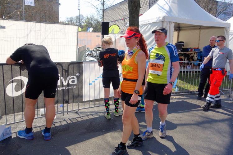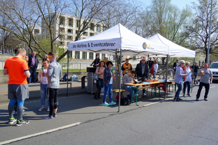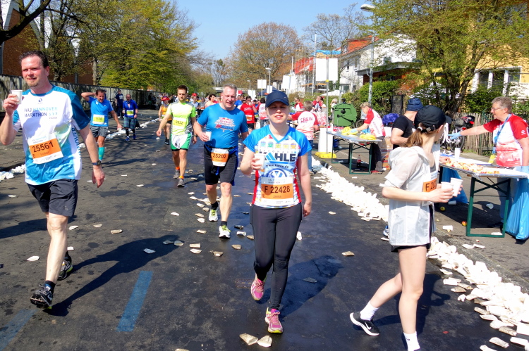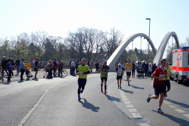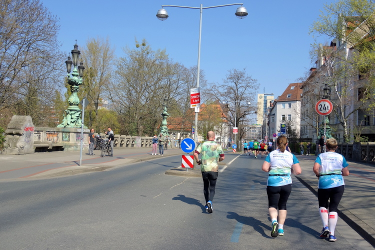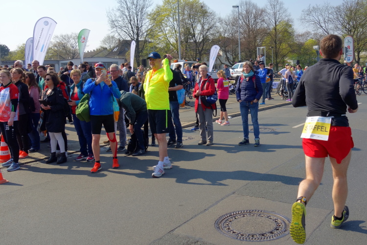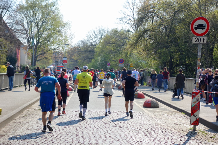 Kaum reihe ich mich im allerletzten Block ein, fällt auch schon der Startschuss. Das nennt man wohl durchdachtes Timing. Kurzes Wiedersehen mit Thomas in Block D. Sieh mal einer an, ist er also doch nicht disqualifiziert worden, denn ein neuer Zeitchip ziert seine Schlappen. Meine Frau startet heute eine Stunde später, denn sie beteiligt sich an der Marathon-Staffel ihrer Firma. Eine solche Staffel besteht aus zwei bis sechs LäuferInnen, die sich die Marathon-Strecke auf verschiedenen Distanzen zwischen 5,5 und 9,2 km teilen. Reihenfolge und Einteilung ist den Staffeln überlassen. Für den gemeinsamen Zieleinlauf können alle Läufer einer Staffel abschließend auf Ihre letzten Läufer warten, um die letzten Meter gemeinsam zu absolvieren. Ich würde sie später bei Wechselzone Emmichplatz (km 27,3) wiedersehen.