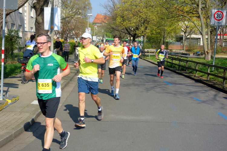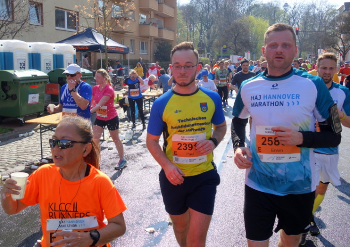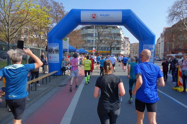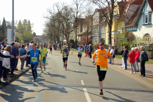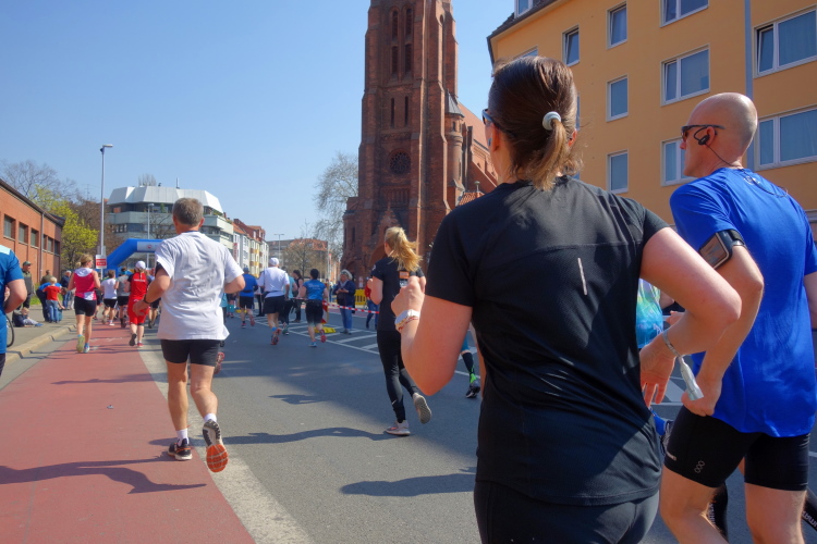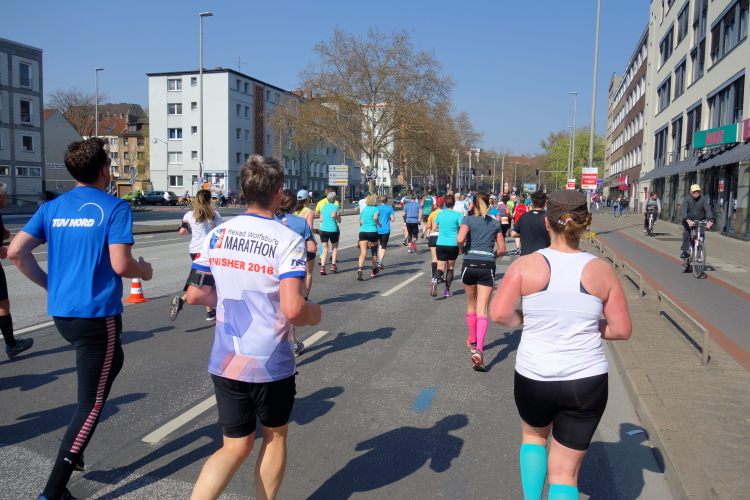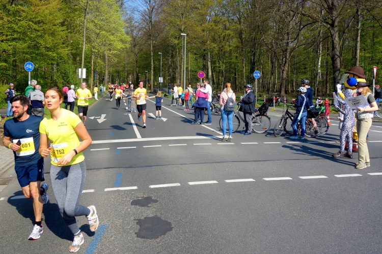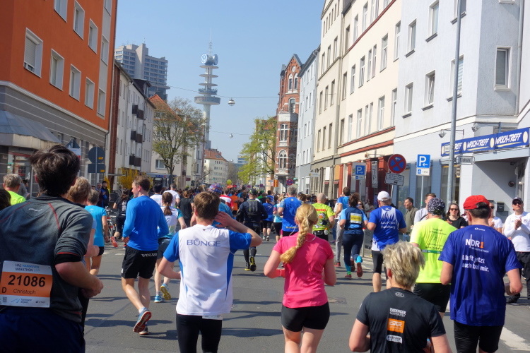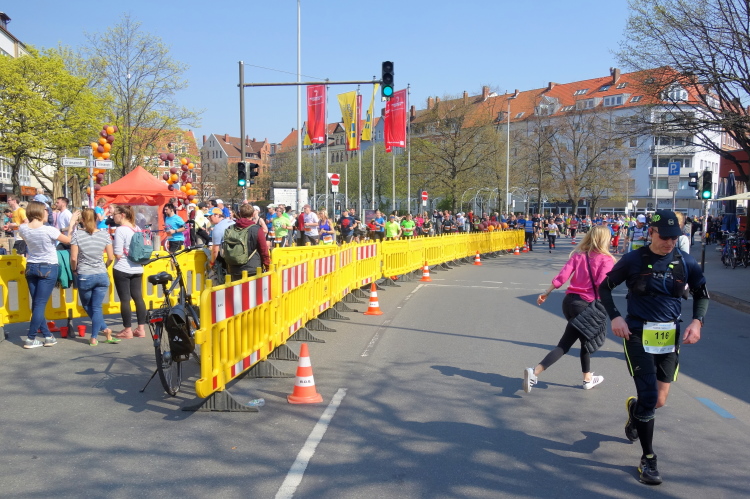 Zunächst einmal lassen wir die Oststadt im wahrsten Sinne „links liegen“, denn der weitere Streckenverlauf führt uns bis hoch nach Groß-Buchholz. Am IHK-Gebäude bei km 16 wird links auf die lange Fritz-Behrens-Allee abgebogen. Es wird wieder Grün, wir durchqueren die Eilenriede, dem rund 640 Hektar großen Stadtwald. Auf der gegenüberliegenden Absperrung kommen uns die ersten Marathonläufer wieder entgegen, mit einem Vorsprung von 11 km – der helle Wahnsinn!