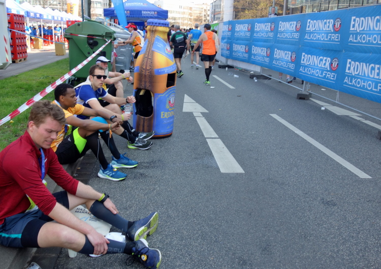 Anstelle meiner Mitstreiter schlendern nun „zwei alte Säcke mit Sonnenbrille“ neben mir her. Deren Plastikumhänge dienen als Aufwärmkleidung vorm noch recht kühlen Start an diesem frühen Sonntagmorgen. Die meisten Marathoni warten bereits in den einzelnen Starter-Blöcken. Verwundert blicke ich hinunter auf einem Aktiven, der gerade sein Warm-Up mit mehreren Liegestützen beendet. Der Hubschrauber des NDR dreht hoch über uns bereits seine Kreise. Wird Zeit, meinen Kleiderbeutel los zu werden. Kurzer Blick auf die Uhr: keine fünf  Minuten mehr bis zum Startschuss. In der Willy-Brandt-Allee stehen die rollenden Garderoben von DB Schenker bereits seit Samstag-Nachmittag Spalier. Achtzehn Trucks sorgen für die Logistik an der Strecke. Mittlerweile hat das Unternehmen weitere Aufgaben für den Veranstalter übernommen: Kiloweise Obst und Getränke werden gelagert und kommissioniert, zudem wird technisches Equipment wie bspw. die Hubbühnen für das NDR Fernseh-Team oder Zuschauerabsperrungen zur Verfügung gestellt. Kleiner Fakt am Rande: 25.000 Meter Absperrband und 8.000 Meter Gitter gewährleisten während der gesamten Dauer der Veranstaltung die Sicherheit aller Teilnehmer und Zuschauer auf der Strecke. Ich reiche meinen Beutel an das junge Personal, es wird auf der Ladefläche des Lkw fachmännisch „entsorgt“.