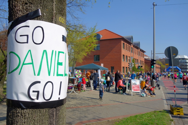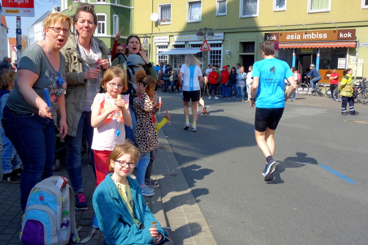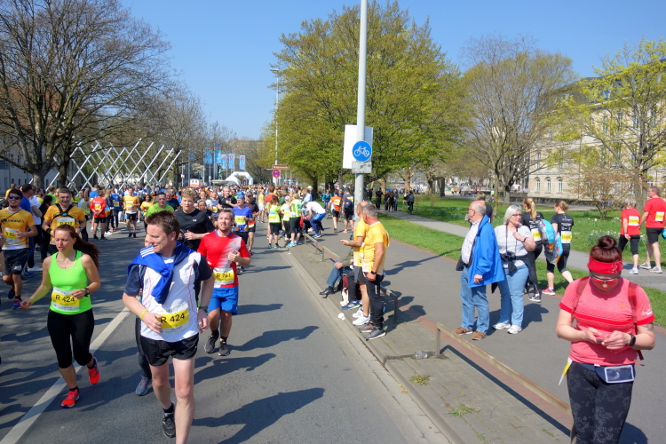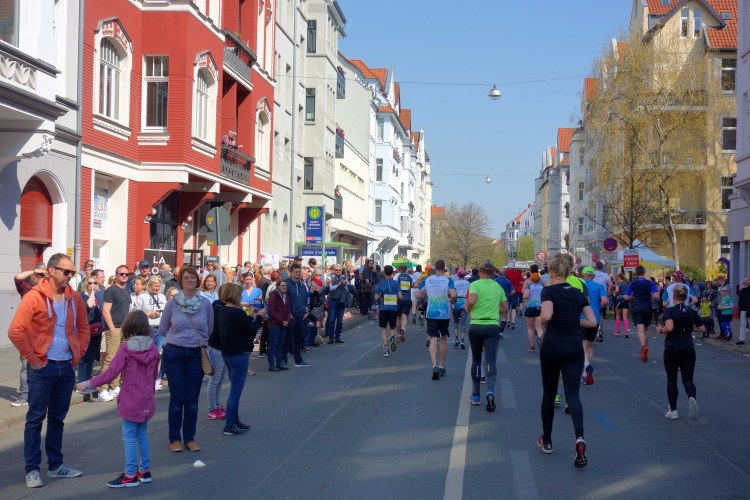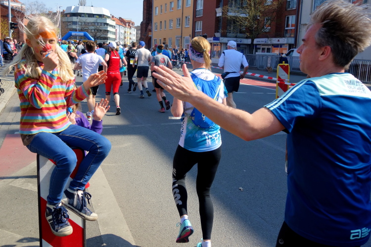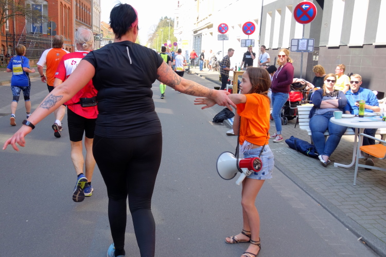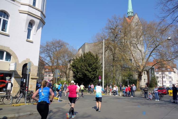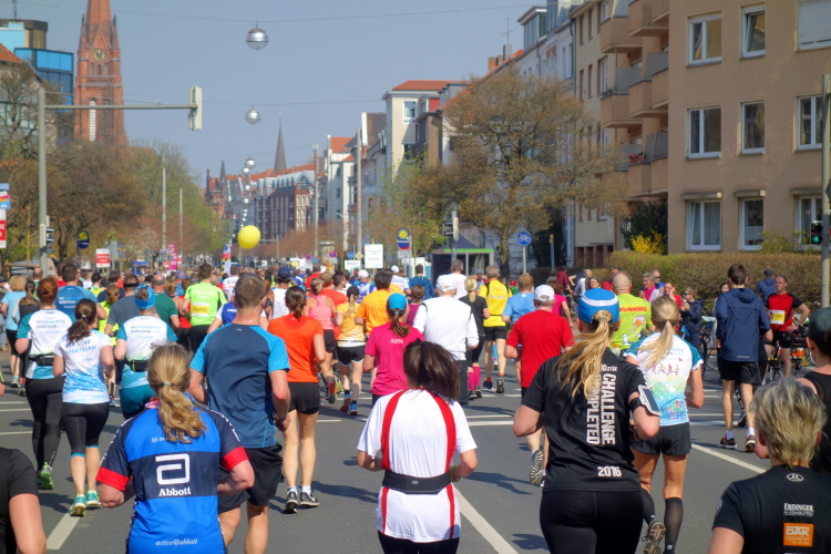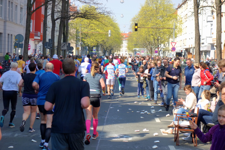 Wir sind im bevölkerungsreichsten Stadtbezirk – eben genau dort, wo die Stimmung regelrecht überkocht. Es ist am Marathontag ein einziges Open-Air Amphitheater. Dicht gedrängt stehen die Zuschauer und jubeln sich die Kehle aus dem Leib! Wir werden wie Helden gefeiert, während wir auf den nächsten Kilometern die grüne Oase des Welfenplatzes entlang laufen und dem Moltkeplatz zusteuern. Seit 1919 findet dort der Wochenmarkt statt, heute startet zugunsten geflüchteter Kinder das Vossfest mit Musik von DJ Holli und vielen Aktionen.
