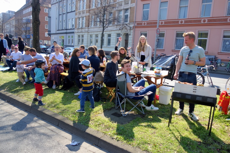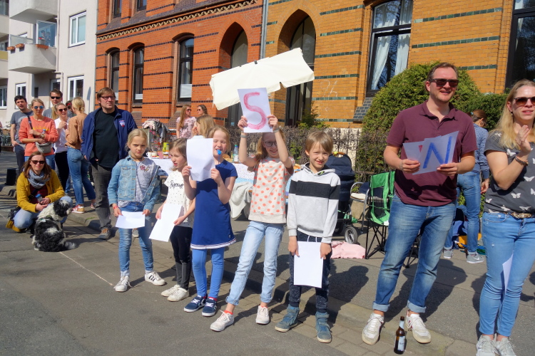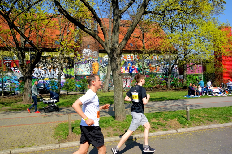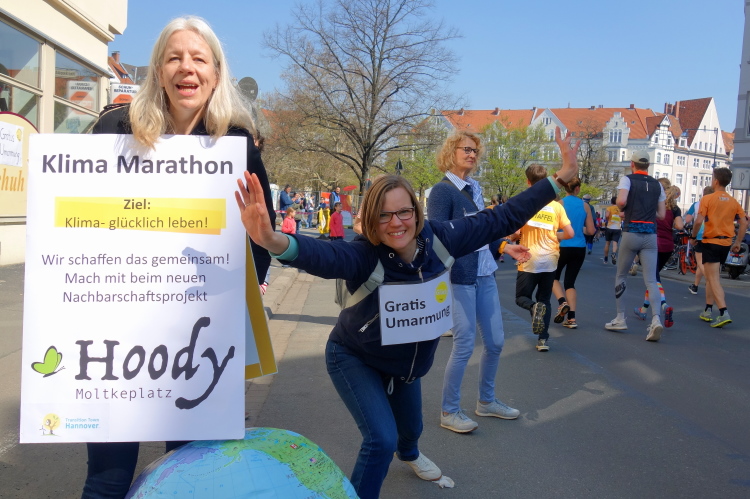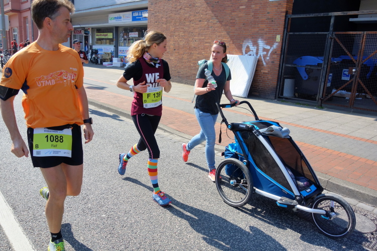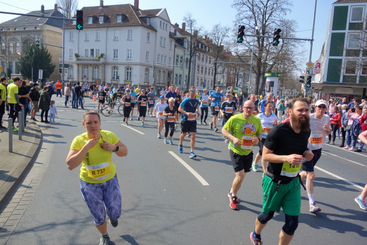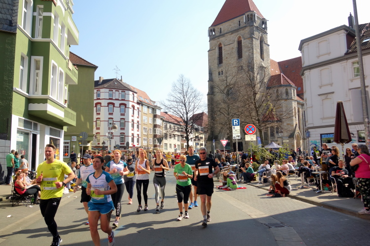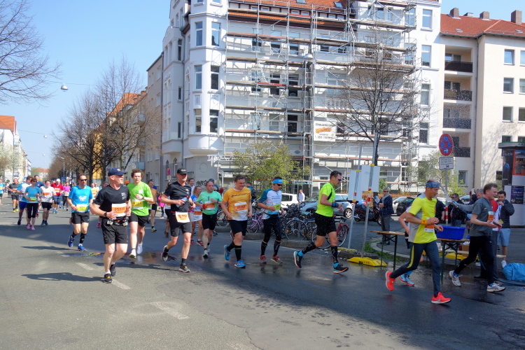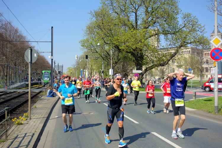 Wir sind im bevölkerungsreichsten Stadtbezirk – eben genau dort, wo die Stimmung regelrecht überkocht. Es ist am Marathontag ein einziges Open-Air Amphitheater. Dicht gedrängt stehen die Zuschauer und jubeln sich die Kehle aus dem Leib! Wir werden wie Helden gefeiert, während wir auf den nächsten Kilometern die grüne Oase des Welfenplatzes entlang laufen und dem Moltkeplatz zusteuern. Seit 1919 findet dort der Wochenmarkt statt, heute startet zugunsten geflüchteter Kinder das Vossfest mit Musik von DJ Holli und vielen Aktionen.