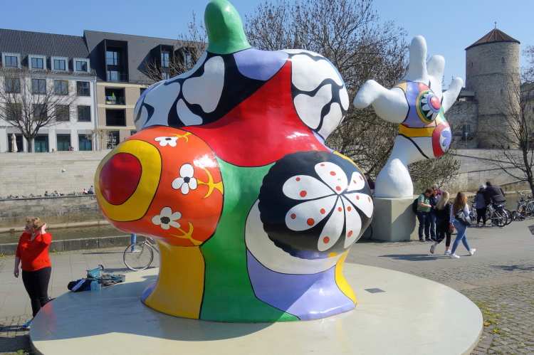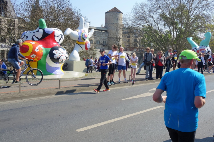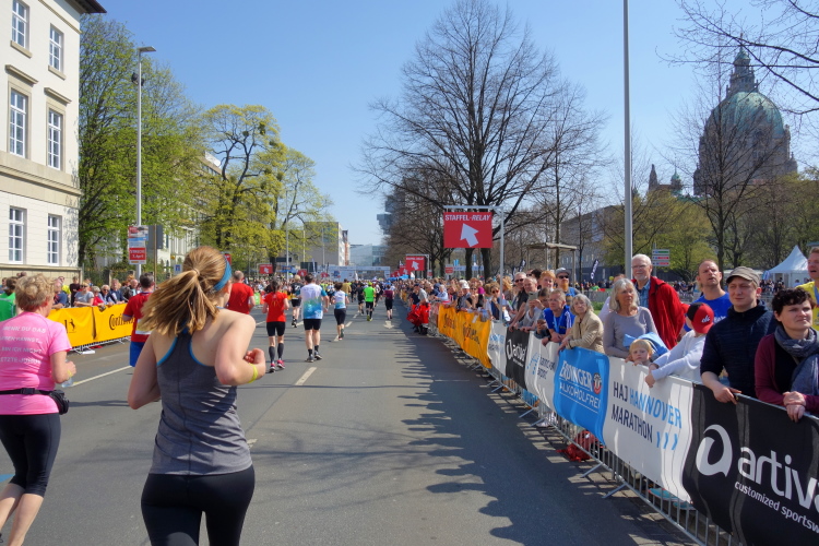 Ich rieche förmlich das Ziel, steuere daher direkt auf das Leibnitzufer zu. Die „Hannover-Runners“ und drei märchenhafte Prinzessinnen bejubeln mit DJ MarcO lautstark auf den letzten Kilometern die Läufer. Die Anwohner sitzen im Freien, die Holzkohle glüht, es fließt literweise Bier und der Grillmeister winkt den Aktiven mit einer Bratwurstzange hinterher. Andere picknicken mit Prosecco. Sommerfeeling pur! Es ist großartig, diese Begeisterung und Freude an und auf diesem letzten Streckenabschnitt zu erleben! Am hohen Ufer auf der linken Straßenseite tanzen die drallen Frauenfiguren von Nikki de Saint Phalle - die drei „Nanas“. Danach passiere ich das Leineschloss, eine klassizistische Schlossanlage, die den Königen von Hannover als Residenz diente. Der Landtag ist dort untergebracht.