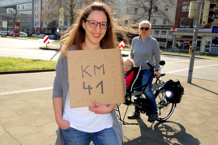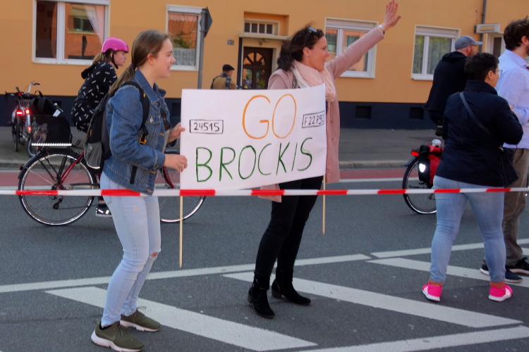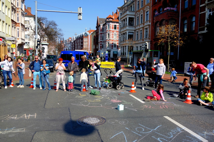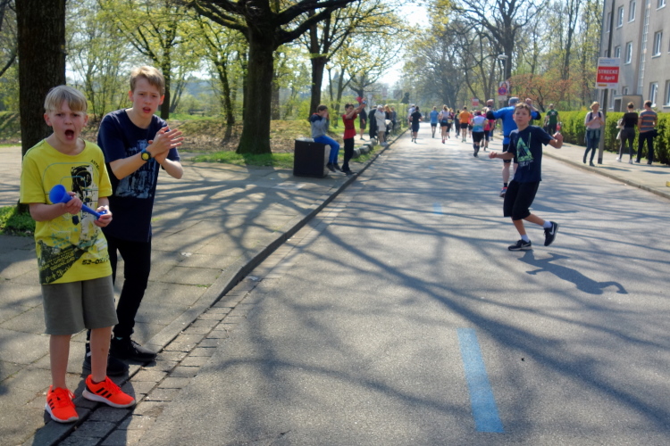 Grandiose Kanalquerung: Zwei 14 Meter hohe Stahlbögen mit quadratischem Querschnitt überspannen auf 41 Metern den Mittellandkanal, eine Stadtbahnhaltestelle wurde direkt auf die Brücke  verlegt. Auf dem Geha-Platz werden Musik-  und Tanzeinlagen geboten. Erneut viele, viele Kinderhände, die abgeklatscht werden wollen. Hier und dort haben die Kids mit Asphaltkreide sogar Grüße hinterlassen. Wie süß, da muss ich doch glatt an meine jüngste Tochter denken, welche gestern am Kinderlauf teilgenommen hat und im Zielbereich Medaille, Urkunde und Beutel  in die Hand gedrückt bekam. Neugierig fischte sie was aus besagtem Beutel, meinte dann trocken: „Papa, nimm Du die Medaille. Ich nehme die bunte Kreide!“.