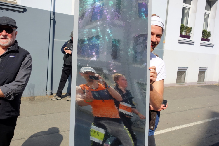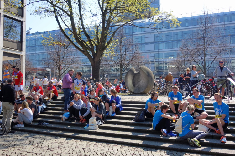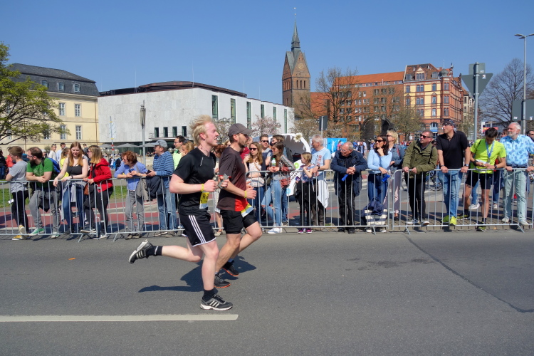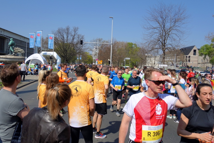 Rechtsseitig folgt wenig später dann einer der größten Festplätze Deutschlands, früher ein Exerzierplatz für Soldaten. Im Sommer findet hier das weltgrößte Schützenfest statt. Das Frühlingsfest hingegen startet in diesem Jahr bereits am 20. April. Kurz darauf laufe ich an der HDI Arena vorbei, dem Fußballstadion von Hannover 96. Fußball geht weiter, für 96 wohl leider in der zweiten Liga. In der Robert-Enke-Straße findet die Live-Übertragung des Marathon in der „Nordkurve“ statt. Wir überqueren die Leine, nun geht es am Maschsee-Nordufer entlang, dann am Fackelträger sowie einem sechs Meter hohen und zwei Tonnen schweren „Kunst-Tornado“ des Sprengel Museums vorbei. Die Läufer genießen am heutigen Tag jedoch den Wirbel, der um sie gemacht wird. Die begeisterten Zuschauer machen den Marathoni nämlich Beine, was das Zeug hält! Hier werden die Sportler schon ab dem ersten Kilometer mit Rasseln und Trommeln bejubelt und angefeuert.