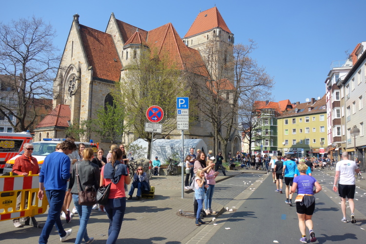 Marathon, Halbmarathon und Staffel aufeinander. Es herrscht dichtes Gedränge, als wären hier alle auf Schnäppchenjagd! Die Dreifaltigkeitskirche kommt in Sichtweite, für mich stets ein Zeichen dafür, dass es nun bald durch Oststadt, List und Vahrenwald geht. Im dichten Läuferstrom lasse ich mich Richtung Kulturzentrum Pavillon treiben. Hier findet unter anderem das „Masala Weltbeat Festival“ statt, das seit 24 Jahren im Sommer die Kulturen der Welt in die Landeshauptstadt Hannover und in Veranstaltungsorte der Region lockt.