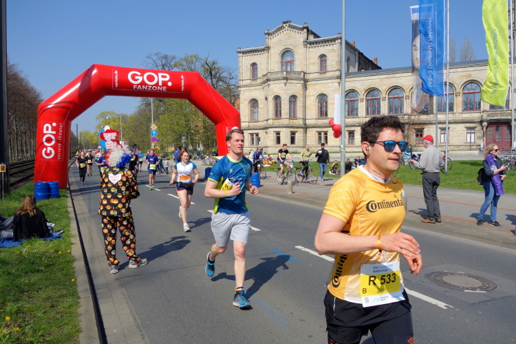 Keine 5 km mehr bis zum Ziel. Ein wenig traurig wird mir ums Herz, denn ich genieße den Lauf in vollen Zügen. Schnurgerade führt die Nienburger Straße Richtung Königsworther Platz. Auf der linken Seite ein weiteres Streckenhighlight, der Welfengarten. Ein Stadtpark, der im Stil englischer Landschaftsgärten angelegt wurde. Die alten Baumgruppen, Teiche und eine historische Brücke des Baumeisters Laves erinnern an die Gestaltung des 19. Jahrhunderts. Kurze Zeit später blicken die meisten Läufer wohl mindestens einmal hinüber zur Gottfried Wilhelm Leibniz Universität, der zweitgrößten Hochschule Niedersachsens. Hier hat der NDR eine weitere Fankurve aufgebaut, wo uns vor allem vielen Studenten anfeuern. Ich erinnere mich noch lebhaft, wie mir unser Joe, auf einem schwarzen Ledersofa sitzend, mit Herrenhäuser in der Hand zuprostete. Ach was, ich kann’s ruhig schreiben, er hatte eine ganze Kiste vor sich. Leider ist der Ärmste verletzt, sonst wären wir dieses Jahr vielleicht zusammen unterwegs.