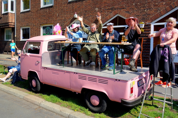 Weil ich fröhlich am Knipsen bin, bemerke ich nicht, dass sich Thomas aus dem Staub gemacht hat. Meine Frau klärt auf: es hat wohl mit seinem Zeitchip zu tun. Mach Dir keine Sorgen, Thomas, ich behalte für mich, dass du ihn Zuhause hast liegen lassen. „Und ich muss jetzt ganz schnell ins nächste TOI-TOI“, verabschiedet sich fluchtartig meine Frau und verschwindet in wohl letzter Sekunde in Dixieland. Viele dieser Verrichtungsörtchen befinden sich sowohl auf dem Veranstaltungsgelände als auch entlang der Strecke. Übrigens, wusstet ihr, dass der Name Dixiklo vom lateinischen "dicsi" stammt und ein Kompositum aus den Verben "dicere" = "sprechen" und "schittere" = "scheißen" sein soll? Dankt mir jetzt aber nicht für Eure nächste Kneipendiskussion.