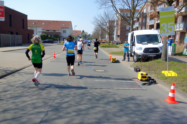 Ein Schild kündet km 35 an, bald ist Feierabend. Nicht so im gleichnamigen Kleingärtnerverein um die Ecke. Ich überhole grüßend einige „Pummelanten“. So werden liebevoll die Finisher des „Osnabrücker Piesberg-Ultramarathon“ genannt. Unübersehbar sind ihre Regenbogenfarbenen Shirts. Ich hatte selbst schon einmal das Vergnügen, den „PUM“ zu laufen und hoffe auf eine Teilnahme im kommenden Jahr. Liebe Grüße an HaWe an dieser Stelle. Wir treffen später noch überraschend aufeinander.