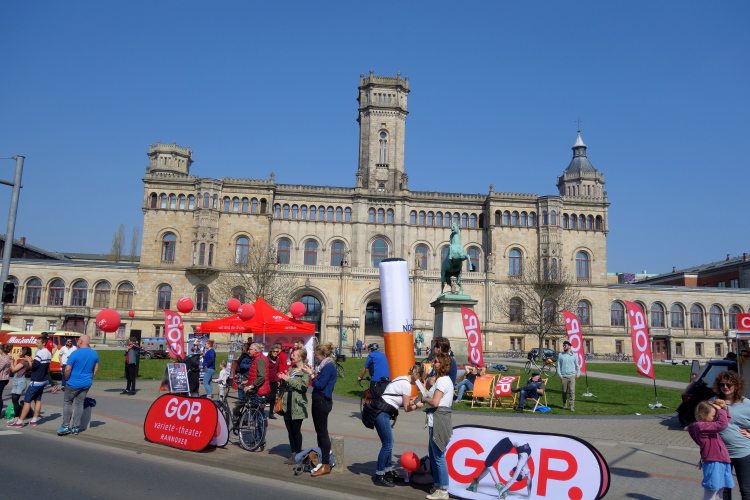 Als Hannoveraner fällt die Anreise leicht: Entweder fährt man mit dem Bus, der Bahn oder dem Auto. Ich, Frauchen und Lauf-Atze Thomas haben uns diesmal für letzteres entschieden. In den Vorjahren bin ich überwiegend mit dem Zug angereist und anschließend vom Hauptbahnhof zum Veranstaltungsgelände flaniert. Knapp anderthalb km zu Fuß genießt man so schon vor dem eigentlichen Lauf die schöne Innenstadt von Hannover. Vorbei am Ernst-August-Denkmal befindet man sich bereits im Herzen der City. Die Bahnhofstraße, die direkt ins Zentrum führt, ist nämlich eine Fußgängerzone auf zwei Ebenen: die Niki de Saint Phalle-Promenade erstreckt sich hierbei zusätzlich ins „Untergeschoss“. An der Kröpcke-Uhr kreuzt auch die Georgstraße, die unter anderem den Aegidentorplatz verbindet. Von dort aus und vorbei an der imposanten Doppelglasfassade des Verwaltungsgebäudes der Nord/LB sind es dann nur noch wenige Meter bis zum Veranstaltungsgelände.